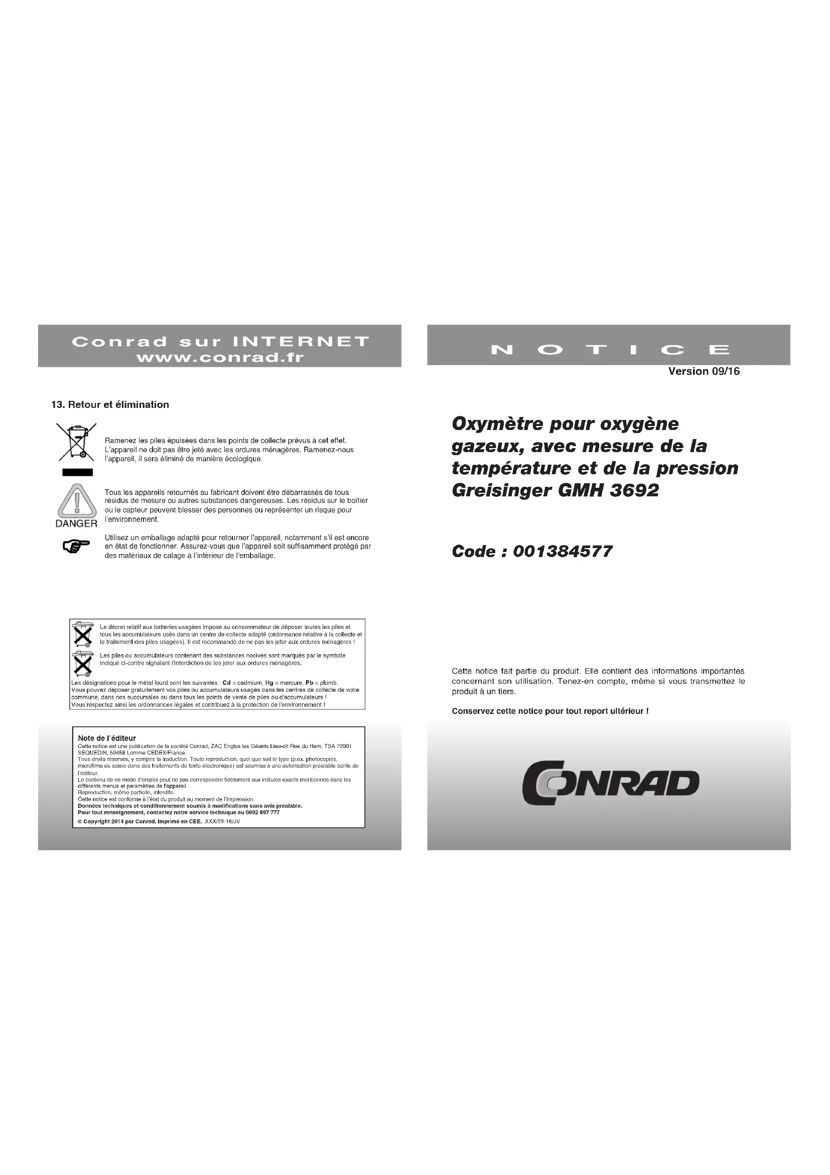 Ramenez les piles épuisées dans les points de collecte prévus à cet effet. L’appareil ne doit pas être jeté avec les ordures ménagères. Ramenez-nous l’appareil, il sera éliminé de manière écologique.Tous les appareils retournés au fabricant doivent être débarrassés de tous résidus de mesure ou autres substances dangereuses. Les résidus sur le boîtier ou le capteur peuvent blesser des personnes ou représenter un risque pour l’environnement.Utilisez un emballage adapté pour retourner l’appareil, notamment s’il est encore en état de fonctionner. Assurez-vous que l’appareil soit suffisamment protégé par des matériaux de calage à l’intérieur de l’emballage.Le décret relatif aux batteries usagées impose au consommateur de déposer toutes les piles et tous les accumulateurs usés dans un centre de collecte adapté (ordonnance relative à la collecte et le traitement des piles usagées). Il est recommandé de ne pas les jeter aux ordures ménagères !Les piles ou accumulateurs contenant des substances nocives sont marqués par le symbole indiqué ci-contre signalant l’interdiction de les jeter aux ordures ménagères. Les désignations pour le métal lourd sont les suivantes : Cd = cadmium, Hg = mercure, Pb = plomb. Vous pouvez déposer gratuitement vos piles ou accumulateurs usagés dans les centres de collecte de votre commune, dans nos succursales ou dans tous les points de vente de piles ou d'accumulateurs !Vous respectez ainsi les ordonnances légales et contribuez à la protection de l’environnement !Note de l’éditeurCette notice est une publication de la société Conrad, ZAC Englos les Géants Lieu-dit Rue du Hem, TSA 72001 SEQUEDIN, 59458 Lomme CEDEX/France.Tous droits réservés, y compris la traduction. Toute reproduction, quel que soit le type (p.ex. photocopies, microfilms ou saisie dans des traitements de texte électronique) est soumise à une autorisation préalable écrite de l’éditeur.Le contenu de ce mode d'emploi peut ne pas correspondre fidèlement aux intitulés exacts mentionnés dans les différents menus et paramètres de l'appareil.Reproduction, même partielle, interdite.Cette notice est conforme à l’état du produit au moment de l’impression.Données techniques et conditionnement soumis à modifications sans avis préalable.Pour tout renseignement, contactez notre service technique au 0892 897 777 © Copyright 2014 par Conrad. Imprimé en CEE. XXX/09-16/JV2 15