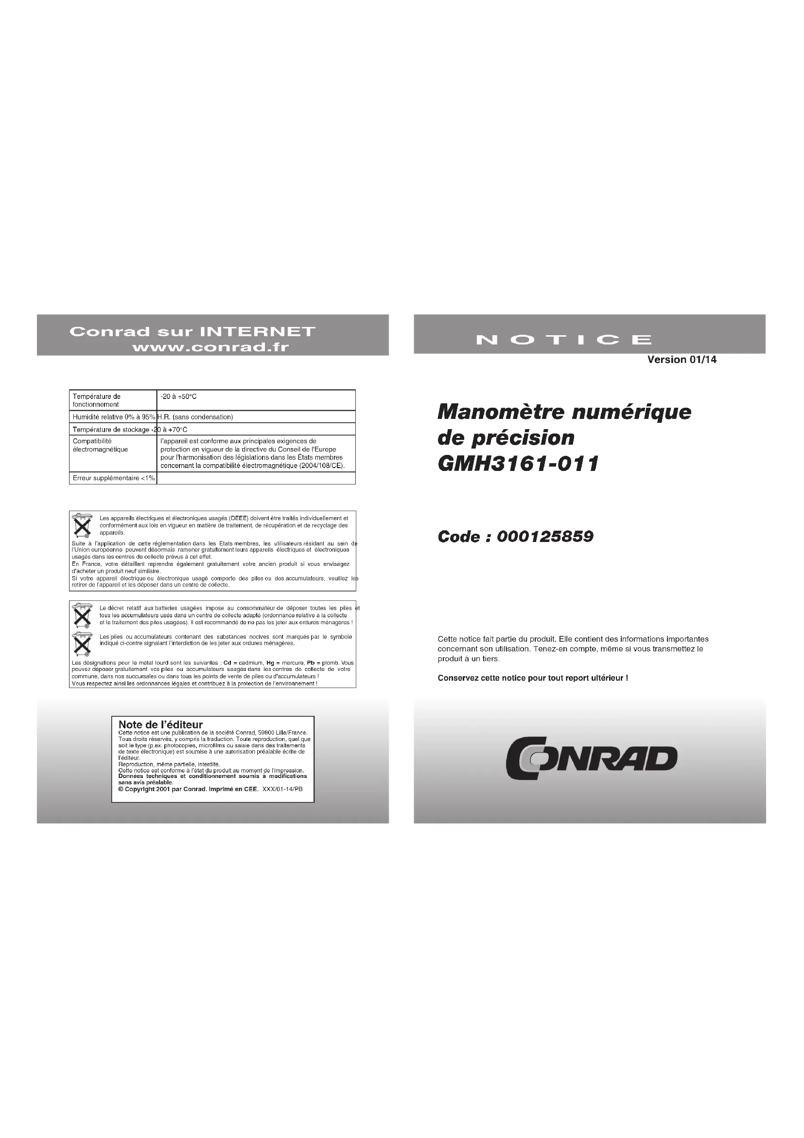 Note de l’éditeur Cette notice est une publication de la société Conrad, 59800 Lille/France.Tous droits réservés, y compris la traduction. Toute reproduction, quel que soit le type (p.ex. photocopies, microfilms ou saisie dans des traitements de texte électronique) est soumise à une autorisation préalable écrite de l’éditeur.Reproduction, même partielle, interdite.Cette notice est conforme à l’état du produit au moment de l’impression.Données techniques et conditionnement soumis à modifications sans avis préalable.© Copyright 2001 par Conrad. Imprimé en CEE. XXX/01-14/PB Manomètre numérique de précision GMH3161-011 Code : 000125859 Cette notice fait partie du produit. Elle contient des informations importantes concernant son utilisation. Tenez-en compte, même si vous transmettez le produit à un tiers. Conservez cette notice pour tout report ultérieur ! N O T I C E Conrad sur INTERNET www.conrad.fr Version 01/14 Température de fonctionnement -20 à +50°CHumidité relative 0% à 95% H.R. (sans condensation)Température de stockage -20 à +70°CCompatibilité électromagnétiquel’appareil est conforme aux principales exigences de protection en vigueur de la directive du Conseil de l'Europe pour l'harmonisation des législations dans les États membres concernant la compatibilité électromagnétique (2004/108/CE).Erreur supplémentaire <1%Les appareils électriques et électroniques usagés (DEEE) doivent être traités individuellement et conformément aux lois en vigueur en matière de traitement, de récupération et de recyclage des appareils.Suite à l’application de cette réglementation dans les Etats membres, les utilisateurs résidant au sein de l’Union européenne peuvent désormais ramener gratuitement leurs appareils électriques et électroniques usagés dans les centres de collecte prévus à cet effet.En France, votre détaillant reprendra également gratuitement votre ancien produit si vous envisagez d’acheter un produit neuf similaire.Si votre appareil électrique ou électronique usagé comporte des piles ou des accumulateurs, veuillez les retirer de l’appareil et les déposer dans un centre de collecte.Le décret relatif aux batteries usagées impose au consommateur de déposer toutes les piles et tous les accumulateurs usés dans un centre de collecte adapté (ordonnance relative à la collecte et le traitement des piles usagées). Il est recommandé de ne pas les jeter aux ordures ménagères !Les piles ou accumulateurs contenant des substances nocives sont marqués par le symbole indiqué ci-contre signalant l’interdiction de les jeter aux ordures ménagères. Les désignations pour le métal lourd sont les suivantes : Cd = cadmium, Hg = mercure, Pb = plomb. Vous pouvez déposer gratuitement vos piles ou accumulateurs usagés dans les centres de collecte de votre commune, dans nos succursales ou dans tous les points de vente de piles ou d'accumulateurs !Vous respectez ainsi les ordonnances légales et contribuez à la protection de l’environnement !2 7