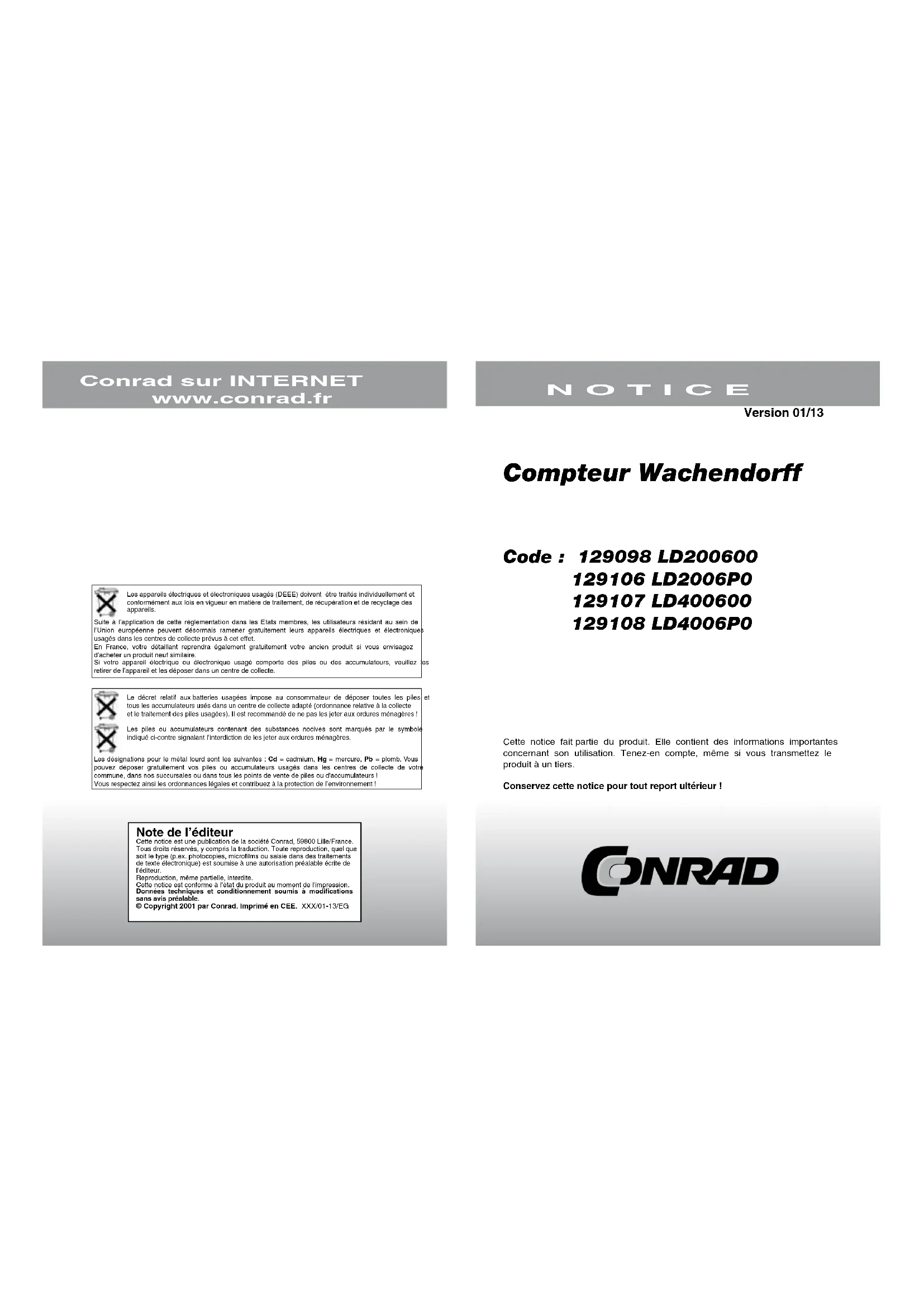 Note de l’éditeur Cette notice est une publication de la société Conrad, 59800 Lille/France.Tous droits réservés, y compris la traduction. Toute reproduction, quel que soit le type (p.ex. photocopies, microfilms ou saisie dans des traitements de texte électronique) est soumise à une autorisation préalable écrite de l’éditeur.Reproduction, même partielle, interdite.Cette notice est conforme à l’état du produit au moment de l’impression.Données techniques et conditionnement soumis à modifications sans avis préalable.© Copyright 2001 par Conrad. Imprimé en CEE. XXX/01-13/EG Compteur Wachendorff Code : 129098 LD200600 129106 LD2006P0 129107 LD400600 129108 LD4006P0 Cette notice fait partie du produit. Elle contient des informations importantes concernant son utilisation. Tenez-en compte, même si vous transmettez le produit à un tiers. Conservez cette notice pour tout report ultérieur ! N O T I C E Conrad sur INTERNET www.conrad.fr Version 01/13 Les appareils électriques et électroniques usagés (DEEE) doivent être traités individuellement et conformément aux lois en vigueur en matière de traitement, de récupération et de recyclage des appareils. Suite à l’application de cette réglementation dans les Etats membres, les utilisateurs résidant au sein de l’Union européenne peuvent désormais ramener gratuitement leurs appareils électriques et électroniques usagés dans les centres de collecte prévus à cet effet.En France, votre détaillant reprendra également gratuitement votre ancien produit si vous envisagez d’acheter un produit neuf similaire.Si votre appareil électrique ou électronique usagé comporte des piles ou des accumulateurs, veuillez les retirer de l’appareil et les déposer dans un centre de collecte.Le décret relatif aux batteries usagées impose au consommateur de déposer toutes les piles et tous les accumulateurs usés dans un centre de collecte adapté (ordonnance relative à la collecte et le traitement des piles usagées). Il est recommandé de ne pas les jeter aux ordures ménagères !Les piles ou accumulateurs contenant des substances nocives sont marqués par le symbole indiqué ci-contre signalant l’interdiction de les jeter aux ordures ménagères. Les désignations pour le métal lourd sont les suivantes : Cd = cadmium, Hg = mercure, Pb = plomb. Vous pouvez déposer gratuitement vos piles ou accumulateurs usagés dans les centres de collecte de votre commune, dans nos succursales ou dans tous les points de vente de piles ou d'accumulateurs !Vous respectez ainsi les ordonnances légales et contribuez à la protection de l’environnement !2 31 Introduction Nous vous remercions pour votre achat d’un produit de notre marque et nous vous félicitons pour cette décision. Les appareils de la série des grands afficheurs LD peuvent être programmés à l’avance pour de nombreuses applications. Afin d’utiliser parfaitement l’intégralité des fonctionnalités de l’appareil, nous vous recommandons de bien vouloir observer ceci : Toute personne chargée de la mise en service ou de la commande de l’appareil doit avoir préalablement lu et compris le mode d’emploi, plus particulièrement les consignes de sécurité !