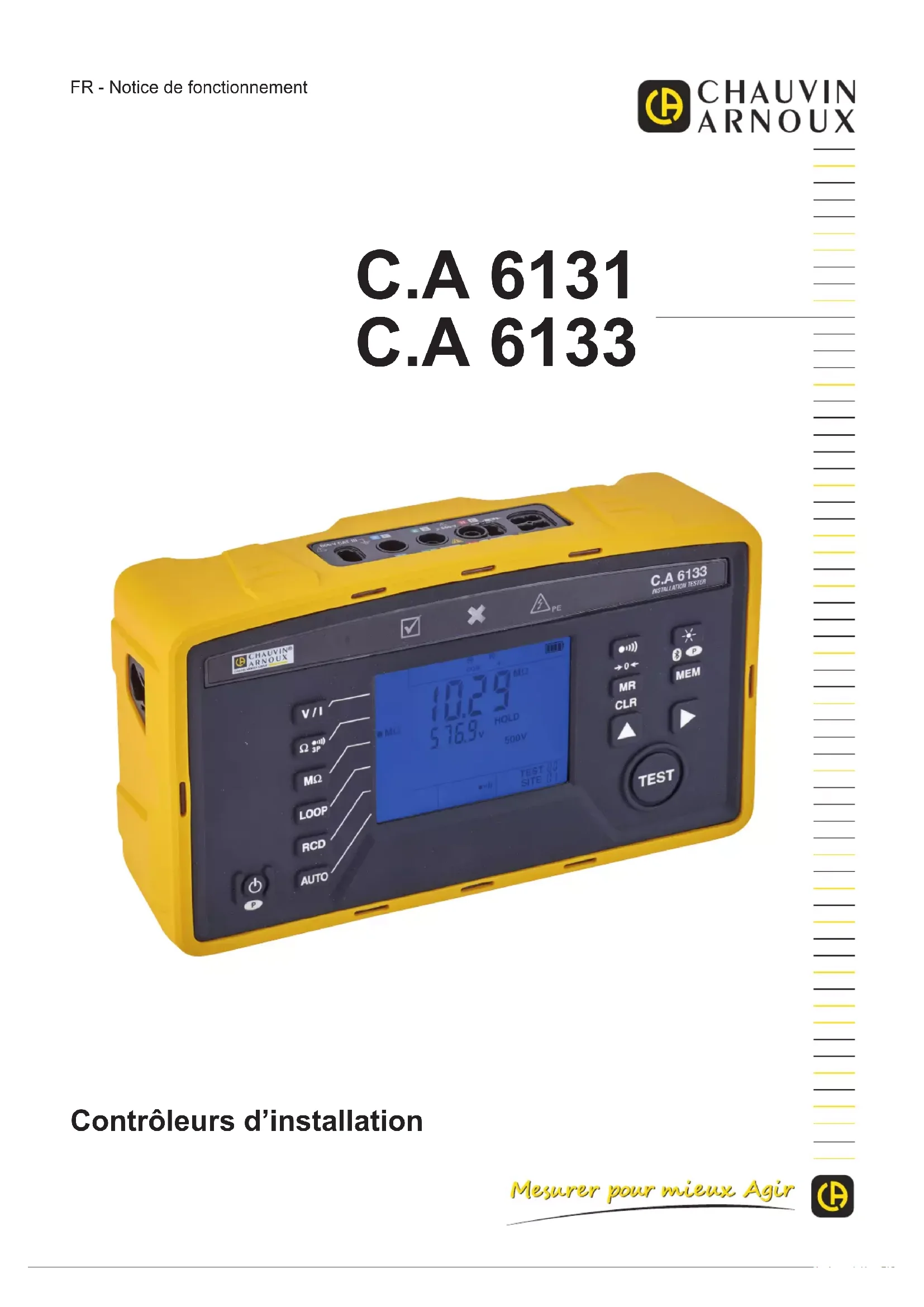 Contrôleurs d’installation FR - Notice de fonctionnement C.A 6131 C.A 61332 ATTENTION, risque de DANGER ! L’opérateur doit consulter la présente notice à chaque fois que ce symbole de danger est rencontré. ATTENTION, risque de choc électrique. La tension appliquée sur les pièces marquées de ce symbole peut être dangereuse. Information ou astuce utile. Terre. La tension sur les bornes ne doit pas dépasser 550 V. Le produit est déclaré recyclable suite à une analyse du cycle de vie conformément à la norme ISO14040. Le marquage CE indique la conformité à la Directive européenne Basse Tension 2014/35/UE, à la Directive Compatibilité Électromagnétique 2014/30/UE et à la Directive sur la Limitation des Substances Dangereuses RoHS 2011/65/UE et 2015/863/UE. Chauvin Arnoux a étudié cet appareil dans le cadre d’une démarche globale d’Eco-Conception. L’analyse du cycle de vie a permis de maîtriser et d’optimiser les eets de ce produit sur l’environnement. Le produit répond plus précisément à des objectifs de recyclage et de valorisation supérieurs à ceux de la réglementation. La poubelle barrée signie que, dans l’Union Européenne, le produit fait l’objet d’une collecte sélective conformément à la directive DEEE 2012/19/UE : ce matériel ne doit pas être traité comme un déchet ménager. Dénition des catégories de mesure ■ La catégorie de mesure IV correspond aux mesurages réalisés à la source de l’installation basse tension. Exemple : arrivée d’énergie, compteurs et dispositifs de protection. ■ La catégorie de mesure III correspond aux mesurages réalisés dans l’installation du bâtiment. Exemple : tableau de distribution, disjoncteurs, machines ou appareils industriels xes. ■ La catégorie de mesure II correspond aux mesurages réalisés sur les circuits directement branchés à l’installation basse tension. Exemple : alimentation d’appareils électrodomestiques et d’outillage portable.