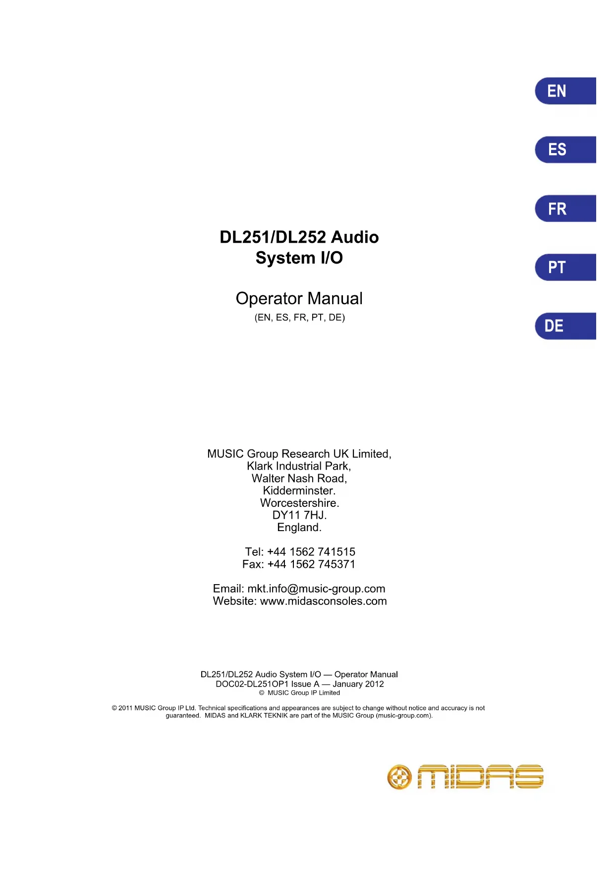 - MIDI — reliez les trois embases DIN MIDI 5-broches à l’équipement MIDI si nécessaire (utilisation uniquement avec les consoles Midas). FR24 DL251 Audio System I/O MUSIC Group IP Limited