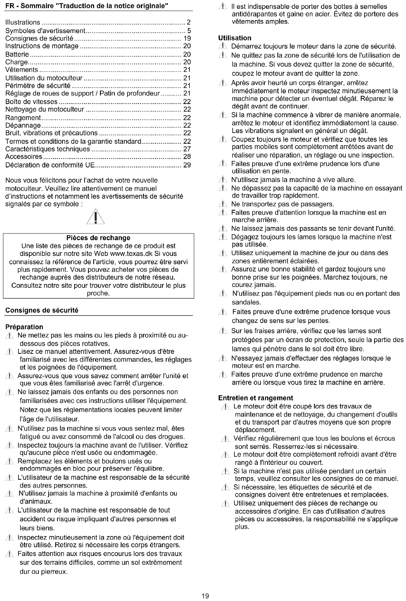 Pièces de rechange Une liste des pièces de rechange de ce produit est disponible sur notre site Web www.texas.dk Si vous connaissez la référence de l’article, vous pourrez être servi plus rapidement. Vous pouvez acheter vos pièces de rechange auprès des distributeurs de notre réseau. Consultez notre site pour trouver votre distributeur le plus proche. Consignes de sécurité Préparation Ne mettez pas les mains ou les pieds à proximité ou au- dessous des pièces rotatives. Lisez ce manuel attentivement. Assurez-vous d'être familiarisé avec les différentes commandes, les réglages et les poignées de l'équipement. Assurez-vous que vous savez comment arrêter l'unité et que vous êtes familiarisé avec l'arrêt d'urgence. Ne laissez jamais des enfants ou des personnes non familiarisées avec ces instructions utiliser l'équipement. Notez que les réglementations locales peuvent limiter l'âge de l'utilisateur. N'utilisez pas la machine si vous vous sentez mal, êtes fatigué ou avez consommé de l'alcool ou des drogues. Inspectez toujours la machine avant de l'utiliser. Vérifiez qu'aucune pièce n'est usée ou endommagée. Remplacez les éléments et boulons usés ou endommagés en bloc pour préserver l'équilibre. L'utilisateur de la machine est responsable de la sécurité des autres personnes. N'utilisez jamais la machine à proximité d'enfants ou d'animaux. L'utilisateur de la machine est responsable de tout accident ou risque impliquant d'autres personnes et leurs biens. Inspectez minutieusement la zone où l'équipement doit être utilisé. Retirez si nécessaire les corps étrangers. Faites attention aux risques encourus lors des travaux sur des terrains difficiles, comme un sol extrêmement dur ou pierreux. Il est indispensable de porter des bottes à semelles antidérapantes et gaine en acier. Évitez de portere des vêtements amples. Utilisation Démarrez toujours le moteur dans la zone de sécurité. Ne quittez pas la zone de sécurité lors de l'utilisation de la machine. Si vous devez quitter la zone de sécurité, coupez le moteur avant de quitter la zone. Après avoir heurté un corps étranger, arrêtez immédiatement le moteur inspectez minutieusement la machine pour détecter un éventuel dégât. Réparez le dégât avant de continuer. Si la machine commence à vibrer de manière anormale, arrêtez le moteur et identifiez immédiatement la cause. Les vibrations signalent en général un dégât. Coupez toujours le moteur et vérifiez que toutes les parties mobiles sont complètement arrêtées avant de réaliser une réparation, un réglage ou une inspection. Faites preuve d'une extrême prudence lors d'une utilisation en pente. N'utilisez jamais la machine à vive allure. Ne dépassez pas la capacité de la machine en essayant de travailler trop rapidement. Ne transportez pas de passagers. Faites preuve d'attention lorsque la machine est en marche arrière. Ne laissez jamais des passants se tenir devant l'unité. Dégagez toujours les lames lorsque la machine n'est pas utilisée. Utilisez uniquement la machine de jour ou dans des zones entièrement éclairées. Assurez une bonne stabilité et gardez toujours une bonne prise sur les poignées. Marchez toujours, ne courez jamais. N'utilisez pas l'équipement pieds nus ou en portant des sandales. Faites preuve d'une extrême prudence lorsque vous changez de sens sur les pentes. Sur les fraises arrière, vérifiez que les lames sont protégées par un écran de protection, seule la partie des lames qui pénètre dans le sol doit être libre. N'essayez jamais d'effectuer des réglages lorsque le moteur est en marche. Faites preuve d'une extrême prudence en marche arrière ou lorsque vous tirez la machine en arrière. Entretien et rangement Le moteur doit être coupé lors des travaux de maintenance et de nettoyage, du changement d'outils et du transport par d'autres moyens que son propre déplacement. Vérifiez régulièrement que tous les boulons et écrous sont serrés. Resserrez-les si nécessaire. Le moteur doit être complètement refroidi avant d'être rangé à l'intérieur ou couvert. Si la machine n'est pas utilisée pendant un certain temps, veuillez consulter les consignes de ce manuel. Si nécessaire, les étiquettes de sécurité et de consignes doivent être entretenues et remplacées. Utilisez uniquement des pièces de rechange ou accessoires d'origine. En cas d'utilisation d'autres pièces ou accessoires, la responsabilité ne s'applique plus.20