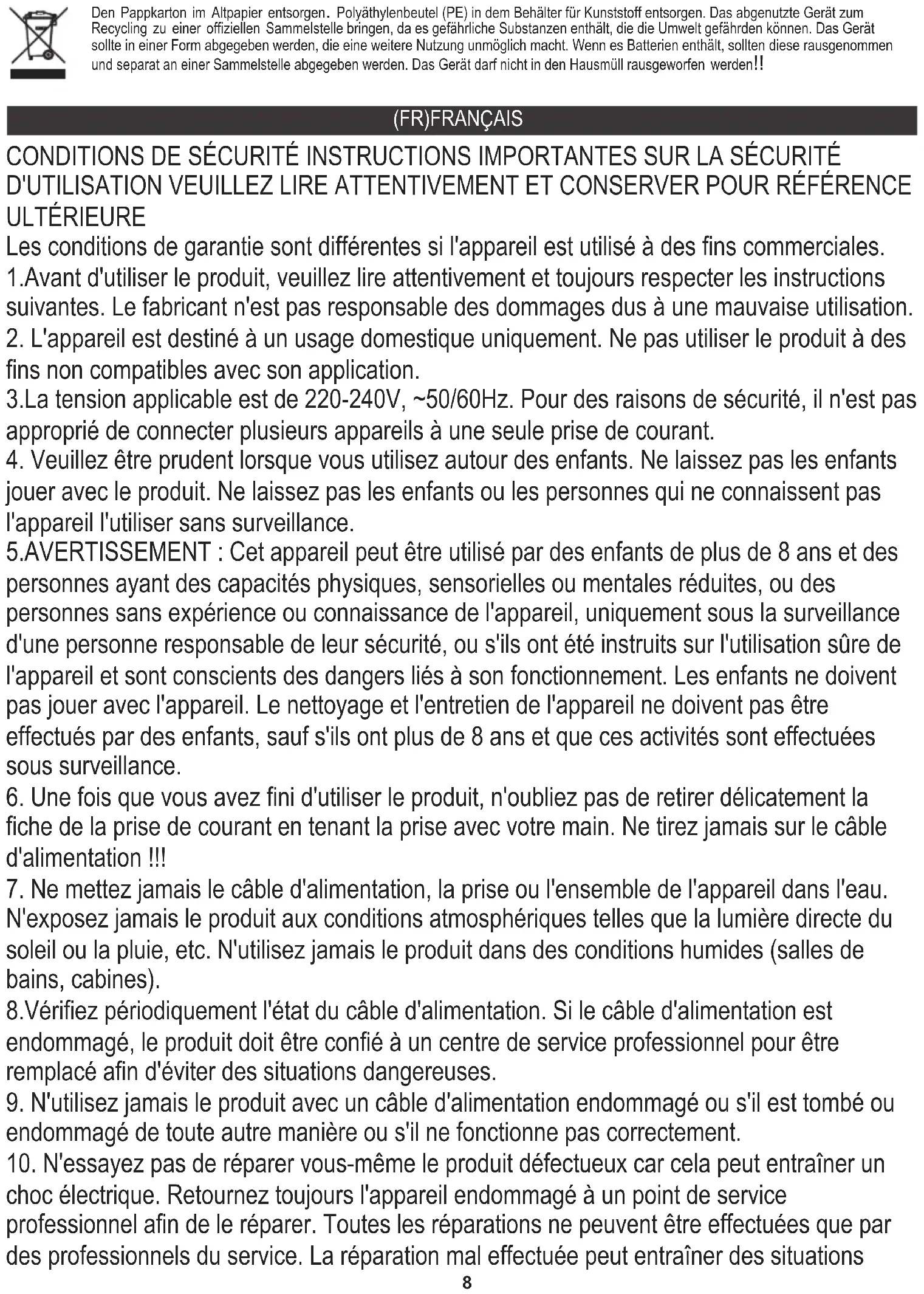 fiche de la prise de courant en tenant la prise avec votre main. Ne tirez jamais sur le câble d'alimentation !!! Les conditions de garantie sont différentes si l'appareil est utilisé à des fins commerciales. 5.AVERTISSEMENT : Cet appareil peut être utilisé par des enfants de plus de 8 ans et des personnes ayant des capacités physiques, sensorielles ou mentales réduites, ou des personnes sans expérience ou connaissance de l'appareil, uniquement sous la surveillance d'une personne responsable de leur sécurité, ou s'ils ont été instruits sur l'utilisation sûre de l'appareil et sont conscients des dangers liés à son fonctionnement. Les enfants ne doivent pas jouer avec l'appareil. Le nettoyage et l'entretien de l'appareil ne doivent pas être effectués par des enfants, sauf s'ils ont plus de 8 ans et que ces activités sont effectuées sous surveillance. 1.Avant d'utiliser le produit, veuillez lire attentivement et toujours respecter les instructions suivantes. Le fabricant n'est pas responsable des dommages dus à une mauvaise utilisation. 3.La tension applicable est de 220-240V, ~50/60Hz. Pour des raisons de sécurité, il n'est pas approprié de connecter plusieurs appareils à une seule prise de courant.