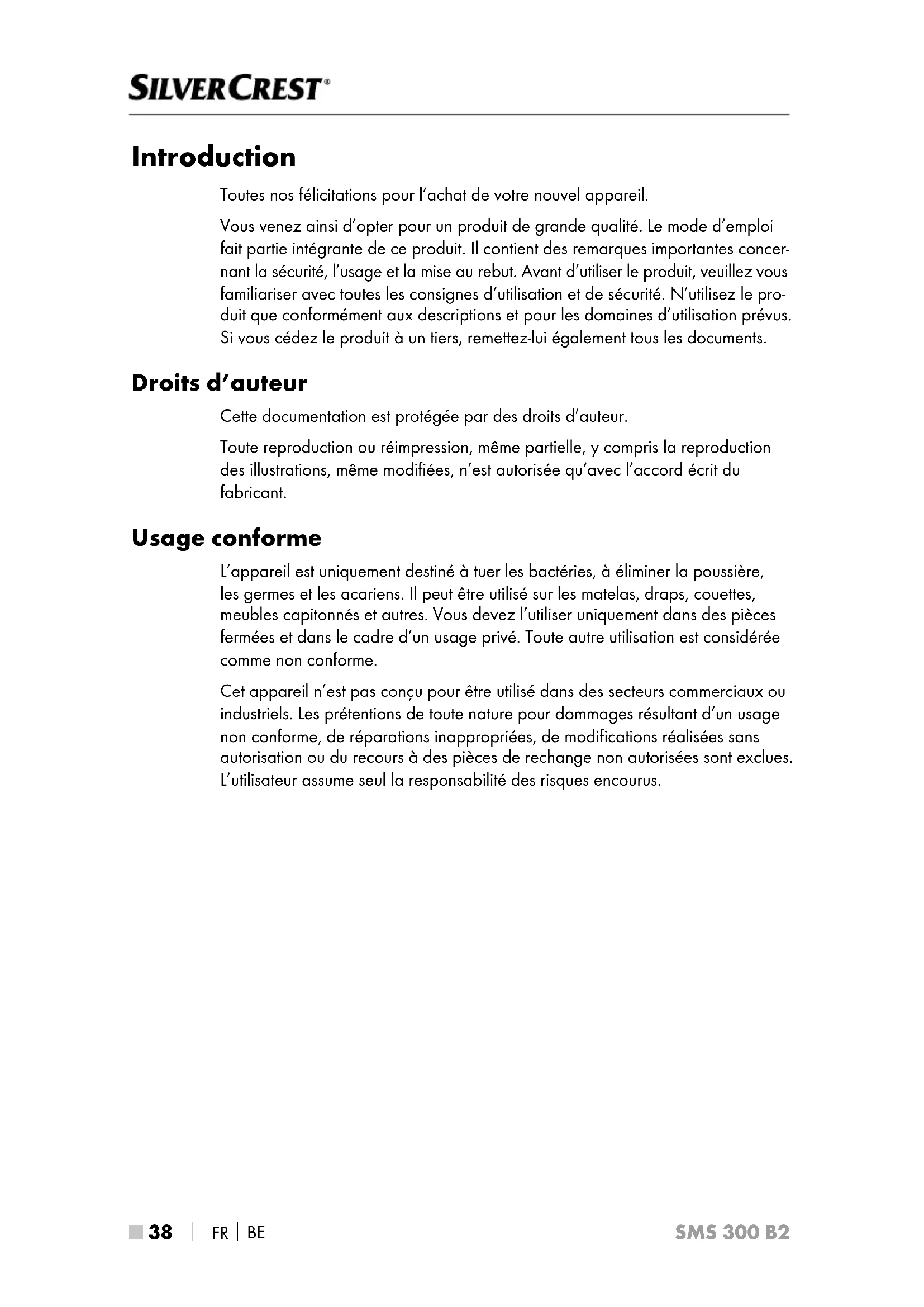 SMS 300 B2 Introduction Toutes nos félicitations pour l’achat de votre nouvel appareil. Vous venez ainsi d’opter pour un produit de grande qualité. Le mode d’emploi fait partie intégrante de ce produit. Il contient des remarques importantes concer- nant la sécurité, l’usage et la mise au rebut. Avant d’utiliser le produit, veuillez vous familiariser avec toutes les consignes d’utilisation et de sécurité. N’utilisez le pro- duit que conformément aux descriptions et pour les domaines d’utilisation prévus. Si vous cédez le produit à un tiers, remettez-lui également tous les documents. Droits d’auteur Cette documentation est protégée par des droits d’auteur. Toute reproduction ou réimpression, même partielle, y compris la reproduction des illustrations, même modifiées, n’est autorisée qu’avec l’accord écrit du fabricant. Usage conforme L’appareil est uniquement destiné à tuer les bactéries, à éliminer la poussière, les germes et les acariens. Il peut être utilisé sur les matelas, draps, couettes, meubles capitonnés et autres. Vous devez l’utiliser uniquement dans des pièces fermées et dans le cadre d’un usage privé. Toute autre utilisation est considérée comme non conforme. Cet appareil n’est pas conçu pour être utilisé dans des secteurs commerciaux ou industriels. Les prétentions de toute nature pour dommages résultant d’un usage non conforme, de réparations inappropriées, de modifications réalisées sans autorisation ou du recours à des pièces de rechange non autorisées sont exclues. L’utilisateur assume seul la responsabilité des risques encourus.FR