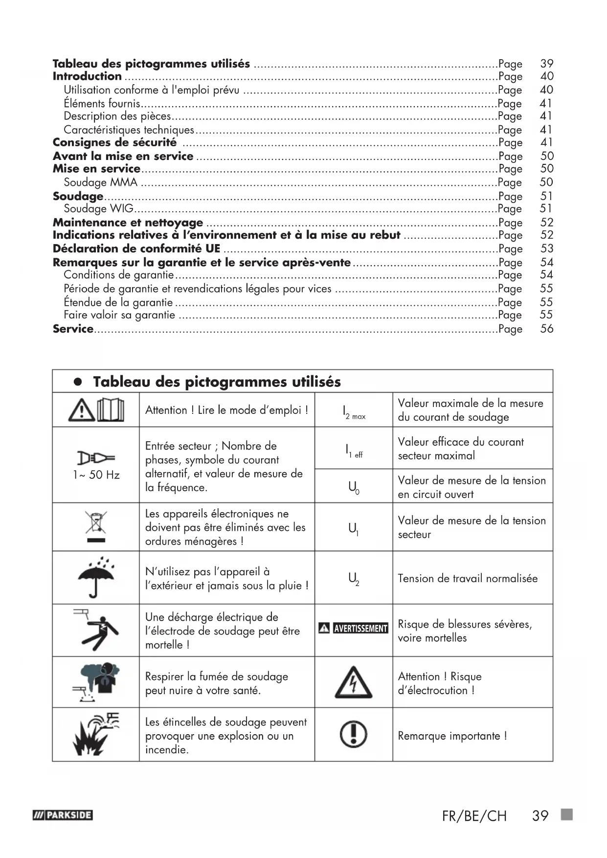 : 70V Type de protection: IP21S Poids: env. 3 kg Épaisseur du matériau à usiner: max. 3,0 mm z Consignes de sécurité Veuillez lire le mode d’emploi et en observer les consignes avec la plus grande attention. Utilisez le présent mode d’emploi pour vous familiariser avec l’appareil, son utilisation conforme et les consignes de sécurité. La plaque signalétique comprend toutes les données techniques de ce poste à souder. Veuillez vous informer des caracté- ristiques techniques de cet appareil.42 FR/BE/CH