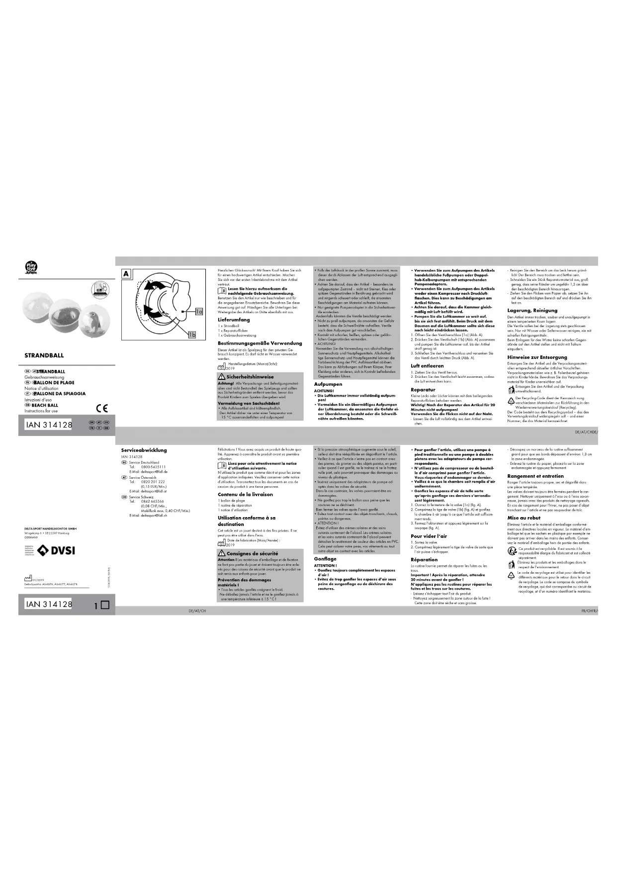STRANDBALL IAN 314128 IAN 314128 DELTA-SPORT HANDELSKONTOR GMBHWragekamp 6 • DE-22397 Hamburg GERMANY 01/2019Delta-Sport-Nr.:AS-6076, AS-6077, AS-6078 STRANDBALLGebrauchsanweisung BALLON DE PLAGENotice d’utilisation PALLONE DA SPIAGGIAIstruzioni d‘uso BEACH BALLInstructions for useFR/CHFR/CHFR/CHFR/CH Félicitations ! Vous avez acquis un produit de haute qua-lité. Apprenez à connaître le produit avant sa première utilisation. Lisez pour cela attentivement la notice d’utilisation suivante. N’utilisez le produit que comme décrit et pour les zones d’application indiquées. Veuillez conserver cette notice d’utilisation. Transmettez tous les documents en cas de cession du produit à une tierce personne. Contenu de la livraison 1 ballon de plage1 rustine de réparation1 notice d’utilisation Utilisation conforme à sa destination Cet article est un jouet destiné à des fins privées. Il ne peut pas être utilisé dans l‘eau. Date de fabrication (Mois/Année) : 01/2019 Consignes de sécurité Attention ! Les matériaux d‘emballage et de fixation ne font pas partie du jouet et doivent toujours être enle-vés pour des raisons de sécurité avant que le produit ne soit remis aux enfants pour jouer.Prévention des dommages matériels !• Tous les articles gonflés craignent le froid. Ne déballez jamais l‘article et ne le gonflez jamais à une température inférieure à 15 °C !• Si la pression atmosphérique augmente sous le soleil, celle-ci doit être rééquilibrée en dégonflant le l‘article.• Veillez à ce que l’article n’entre pas en contact avec des pierres, du gravier ou des objets pointus, en parti-culier quand il est gonflé, ne le traînez ni ne le frottez nulle part, cela pouvant provoquer des dommages au niveau du plastique.• Insérez uniquement des adaptateurs de pompe ad-aptés dans les valves de sécurité. Dans le cas contraire, les valves pourraient être en-dommagées.• Ne gonflez pas trop le ballon sous peine que les coutures ne se déchirent. Bien fermer les valves après l’avoir gonflé.• Evitez tout contact avec des objets tranchants, chauds, pointus ou dangereux.• ATTENTION ! Évitez d’utiliser des crèmes solaires et des soins cutanés contenant de l’alcool. Les crèmes solaires et les soins cutanés contenant de l’alcool peuvent détacher le revêtement de couleur des articles en PVC. Cela peut colorer votre peau, vos vêtements ou tout autre objet en contact avec les articles. Gonflage ATTENTION !• Gonflez toujours complètement les espaces d’air !• Evitez de trop gonfler les espaces d’air sous peine de surgonflage ou de déchirure des coutures.• Pour gonfler l’article, utilisez une pompe à pied traditionnelle ou une pompe à doubles pistons avec les adaptateurs de pompe cor-respondants.• N’utilisez pas de compresseur ou de bouteil-le d’air comprimé pour gonfler l’article. Vous risqueriez d’endommager ce dernier.• Veillez à ce que la chambre soit remplie d‘air uniformément.• Gonflez les espaces d’air de telle sorte qu‘après gonflage ces derniers s‘arrondis-sent légèrement.1. Ouvrez la fermeture de la valve (1a) (fig. A).2. Comprimez la tige de valve (1b) (fig. A) et gonflez la chambre à air jusqu‘à ce que l‘article soit suffisam-ment tendu.3. Fermez l‘obturateur et appuyez légèrement sur la soupape (fig. A). Pour vider l‘air