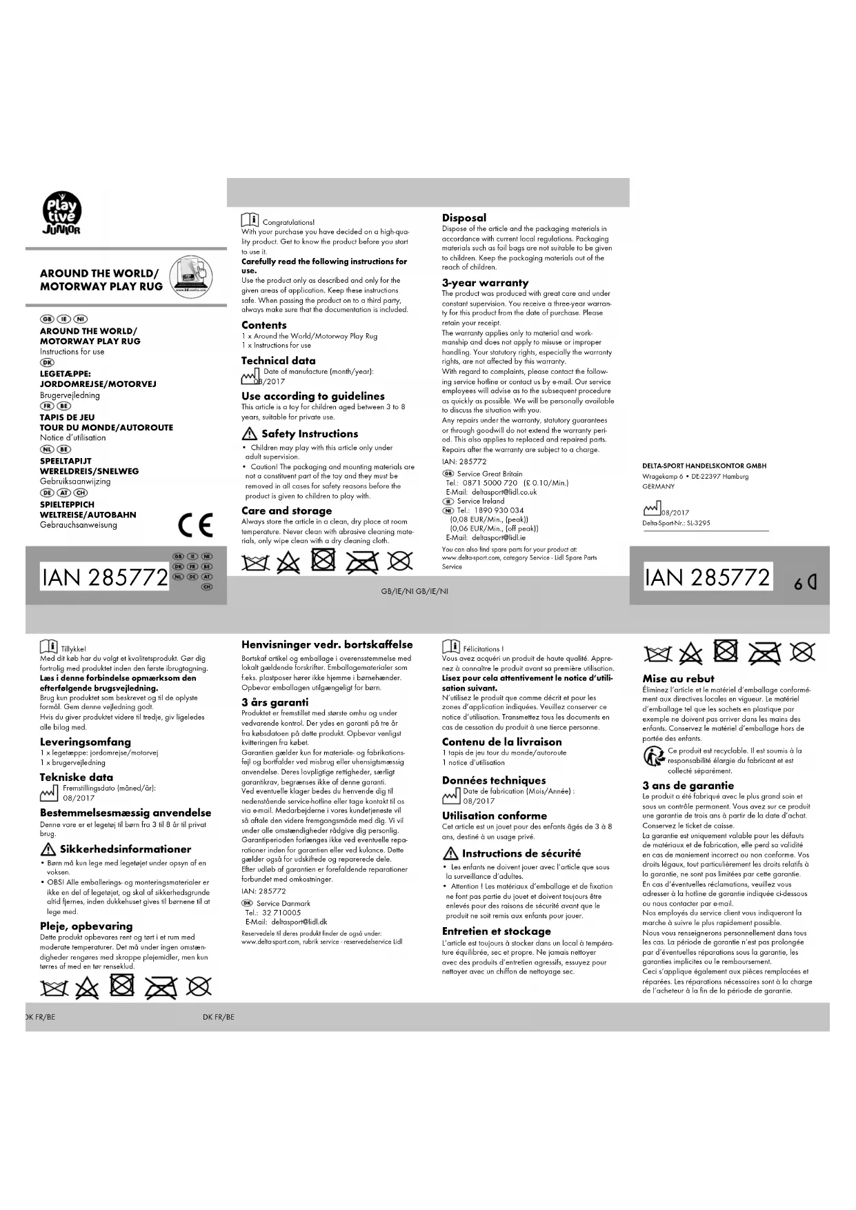 - Attention ! Les matériaux d‘emballage et de fixation ne font pas partie du jouet et doivent toujours être enlevés pour des raisons de sécurité avant que le produit ne soit remis aux enfants pour jouer. Entretien et stockage L’article est toujours à stocker dans un local à tempéra- ture équilibrée, sec et propre. Ne jamais nettoyer avec des produits d’entretien agressifs, essuyez pour nettoyer avec un chiffon de nettoyage sec. Mise au rebut Éliminez l‘article et le matériel d‘emballage conformé- ment aux directives locales en vigueur. Le matériel d‘emballage tel que les sachets en plastique par exemple ne doivent pas arriver dans les mains des enfants. Conservez le matériel d‘emballage hors de portée des enfants. Ce produit est recyclable. Il est soumis à la responsabilité élargie du fabricant et est collecté séparément. 3 ans de garantie Le produit a été fabriqué avec le plus grand soin et sous un contrôle permanent. Vous avez sur ce produit une garantie de trois ans à partir de la date d’achat. Conservez le ticket de caisse. La garantie est uniquement valable pour les défauts de matériaux et de fabrication, elle perd sa validité en cas de maniement incorrect ou non conforme. Vos droits légaux, tout particulièrement les droits relatifs à la garantie, ne sont pas limitées par cette garantie. En cas d‘éventuelles réclamations, veuillez vous adresser à la hotline de garantie indiquée ci-dessous ou nous contacter par e-mail. Nos employés du service client vous indiqueront la marche à suivre le plus rapidement possible. Nous vous renseignerons personnellement dans tous les cas. La période de garantie n‘est pas prolongée par d’éventuelles réparations sous la garantie, les garanties implicites ou le remboursement. Ceci s‘applique également aux pièces remplacées et réparées. Les réparations nécessaires sont à la charge de l’acheteur à la fin de la période de garantie. IAN 285772 DELTA-SPORT HANDELSKONTOR GMBHWragekamp 6 • DE-22397 HamburgGERMANY 08/2017Delta-Sport-Nr.: SL-3295NL/BE NL/BE IAN: 285772 Service België Tel.: 070 270 171 (0,15 EUR/Min.) E-Mail: deltasport@lidl.be Service Nederland Tel.: 0900 0400223 (0,10 EUR/Min.) E-Mail: deltasport@lidl.nl Reserve-onderdelen voor uw product vindt u ook via: www.delta-sport.com, rubriek Service - reserve-onderdelen-ser- vice Lidl Hartelijk gefeliciteerd! Met de aankoop hebt u gekozen voor een hoog- waardig product. Maak u daarom voor de eerste ingebruikname vertrouwd met het product. Lees hiervoor deze gebruiksaanwijzing aandachtig door. Gebruik het product alleen zoals beschreven en uits- luitend voor de aangegeven doeleinden. Bewaar de handleiding zorgvuldig. Als u het product aan derden geeft, dient u ook deze documenten te overhandigen. Leveringsomvang 1 x Speeltapijt wereldreis/snelweg 1 x Gebruiksaanwijzing Technische gegevens Productiedatum (maand/jaar): 08/2017 Correct gebruik Dit artikel is een speelgoed voor kinderen van 3 tot 8 jaar voor niet-commercieel gebruik. Veiligheidsinstructies