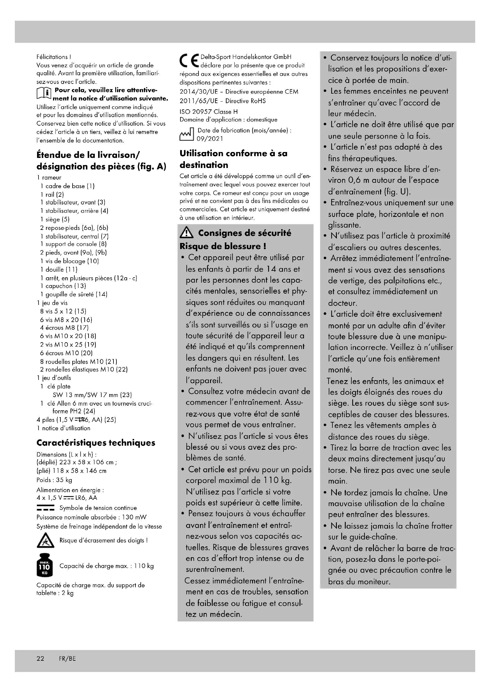Capacité de charge max. : 110 kg Capacité de charge max. du support de tablette : 2 kg Delta-Sport Handelskontor GmbH déclare par la présente que ce produit répond aux exigences essentielles et aux autres dispositions pertinentes suivantes : 2014/30/UE – Directive européenne CEM 2011/65/UE – Directive RoHS ISO 20957 Classe H Domaine d’application : domestique Date de fabrication (mois/année) : 09/2021 Utilisation conforme à sa destination Cet article a été développé comme un outil d’en- traînement avec lequel vous pouvez exercer tout votre corps. Ce rameur est conçu pour un usage privé et ne convient pas à des fins médicales ou commerciales. Cet article est uniquement destiné à une utilisation en intérieur. Consignes de sécurité Risque de blessure !