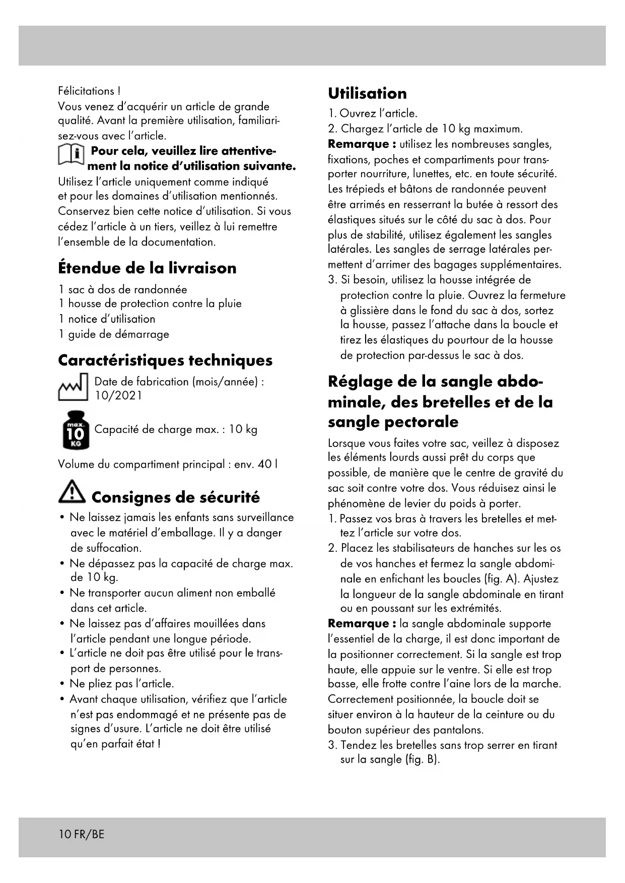 Capacité de charge max. : 10 kg Volume du compartiment principal : env. 40 l Consignes de sécurité