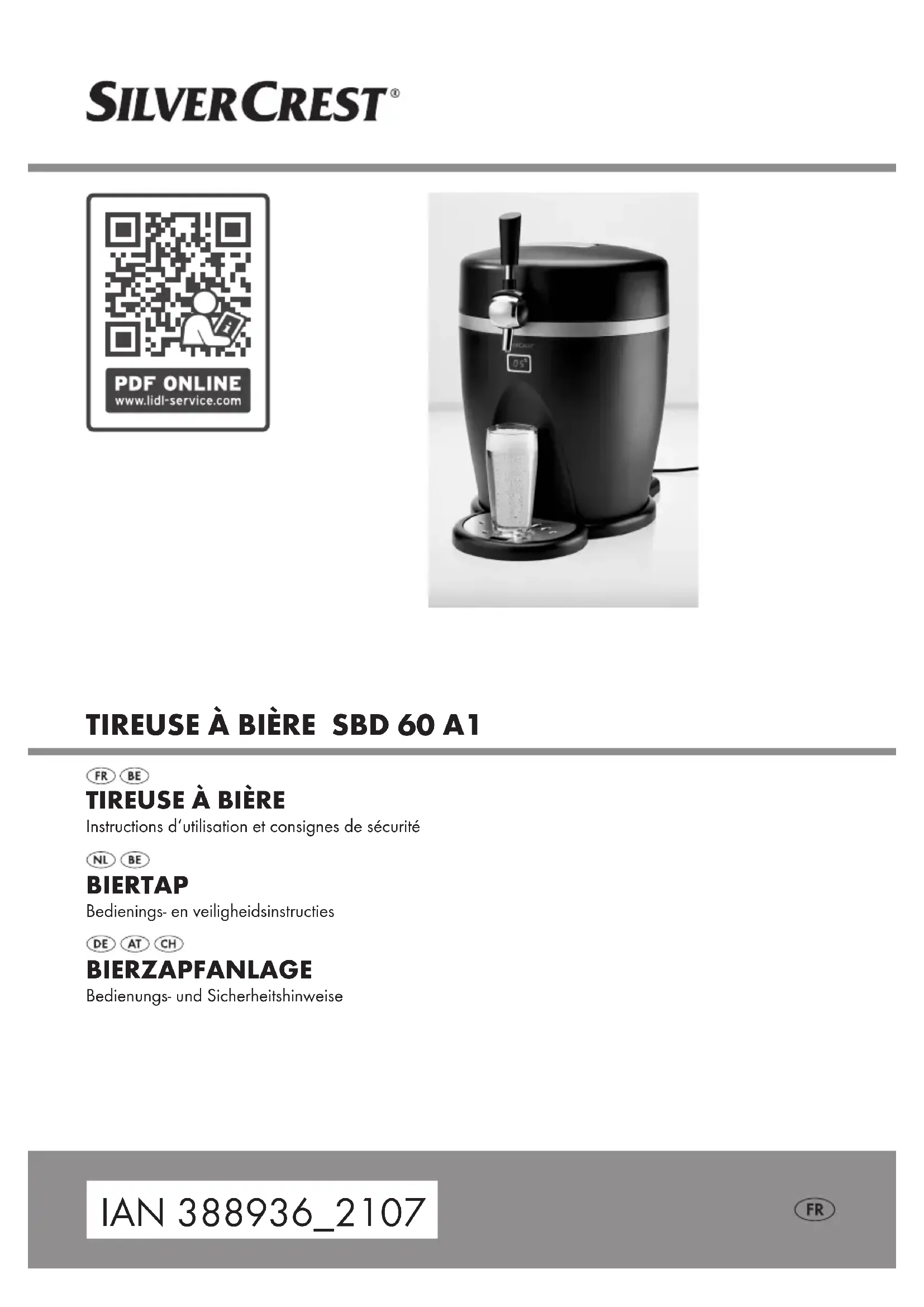- s‘il présente les qualités qu‘un acheteur peut légitimement attendre eu égard aux déclarations publiques faites par le vendeur, par le producteur ou par son représentant, notamment dans la publicité ou l‘étiquetage ; 2° Ou s‘il présente les caractéristiques définies d‘un commun accord par les parties ou être propre à tout usage spécial recherché par l‘acheteur, porté à la connaissance du vendeur et que ce dernier a accepté. Article L217-12 du Code de la consommation L‘action résultant du défaut de conformité se prescrit par deux ans à compter de la délivrance du bien. Article 1641 du Code civil Le vendeur est tenu de la garantie à raison des défauts cachés de la chose vendue qui la rendent impropre à l‘usage auquel on la destine, ou qui diminuent tellement cet usage que l‘acheteur ne l‘aurait pas acquise, ou n‘en aurait donné qu‘un moindre prix, s‘il les avait connus. Article 1648 1er alinéa du Code civil L‘action résultant des vices rédhibitoires doit être intentée par l‘acquéreur dans un délai de deux ans à compter de la découverte du vice. Les pièces détachées indispensables à l’utilisation du produit sont disponibles pendant la durée de la garantie du produit.17FR/BE Le produit a été fabriqué selon des critères de qualité stricts et contrôlé consciencieusement avant sa livraison. En cas de défaillance, vous êtes en droit de retourner ce produit au vendeur. La présente garantie ne constitue pas une restriction de vos droits légaux. Ce produit bénéficie d‘une garantie de 3 ans à compter de sa date d’achat. La durée de garantie débute à la date d’achat. Veuillez conserver le ticket de caisse original. Il fera office de preuve d’achat. Si un problème matériel ou de fabrication devait survenir dans 3 ans suivant la date d‘achat de ce produit, nous assurons à notre discrétion la réparation ou le remplacement du produit sans frais supplémentaires. La garantie prend fin si le produit est endommagé suite à une utilisation inappropriée ou à un entretien défaillant. La garantie couvre les vices matériels et de fabrication. Cette garantie ne s’étend ni aux pièces du produit soumises à une usure normale (p. ex. des piles) et qui, par conséquent, peuvent être considérées comme des pièces d’usure, ni aux dommages sur des composants fragiles, comme des interrupteurs, des batteries ou des éléments fabriqués en verre. Faire valoir sa garantie Pour garantir la rapidité d’exécution de la procédure de garantie, veuillez respecter les indications suivantes : Veuillez conserver le ticket de caisse et la référence du produit (IAN 388936_2107) à titre de preuve d’achat pour toute demande. Le numéro de référence de l’article est indiqué sur la plaque d’identification, gravé sur la page de titre de votre manuel (en bas à gauche) ou sur un autocollant apposé sur la face arrière ou inférieure du produit. En cas de dysfonctionnement du produit, ou de tout autre défaut, contactez en premier lieu le service après-vente par téléphone ou par e-mail aux coordonnées indiquées ci-dessous. Vous pouvez alors envoyer franco de port tout produit considéré comme défectueux au service clientèle indiqué, accompagné de la preuve d’achat (ticket de caisse) et d’une description écrite du défaut avec mention de sa date d’apparition. Service après-vente Service après-vente France Tél.: 0800904879 E-Mail: owim@lidl.fr Service après-vente Belgique Tél.: 080071011 Tél.: 80023970 (Luxembourg) E-Mail: owim@lidl.be18 NL/BE Gebruikte waarschuwingen en symbolen ........................ Pagina 19 Inleiding................................................................ Pagina 20 Beoogd gebruik .......................................................... Pagina 20 Levering ................................................................ Pagina 20 Benodigde accessoires .................................................... Pagina 20 Onderdelenbeschrijving.................................................... Pagina 20 Technische gegevens ...................................................... Pagina 21 Veiligheidstips ........................................................ Pagina 21 Voorbereiding......................................................... Pagina 23 Het product aansluiten en in/uitschakelen...................................... Pagina 24 Bier koelen .............................................................. Pagina 24 Bereid het product en het biervat voor......................................... Pagina 25 Bediening .............................................................. Pagina 26 Reiniging en onderhoud ............................................. Pagina 26 Opbergen.............................................................. Pagina 27 Probleemoplossing................................................... Pagina 28 Afvoer.................................................................. Pagina 28 Garantie ............................................................... Pagina 29 Afwikkeling in geval van garantie ............................................ Pagina 29 Service ................................................................. Pagina 2919NL/BE Gebruikte waarschuwingen en symbolen In deze gebruiksaanwijzing en op de verpakking worden de volgende waarschuwingen gebruikt: Lees de gebruikershandleiding. Geschikt voor levensmiddelen Dit product heeft geen negatieve invloed op smaak of geur. GEVAAR! Dit symbool met de aanduiding “Gevaar” duidt op een groot risico op gevaar dat, indien niet vermeden, zware verwondingen of de dood tot gevolg kan hebben. Gevaar– Kans op elektrische schokken! Hertz (netfrequentie) WAARSCHUWING! Dit symbool met de aanduiding “Waarschuwing” betekent een middelmatig risico op gevaar dat, indien niet vermeden, zware verwondingen of de dood tot gevolg kan hebben. Watt Wisselstroom/-spanning VOORZICHTIG! Dit sy