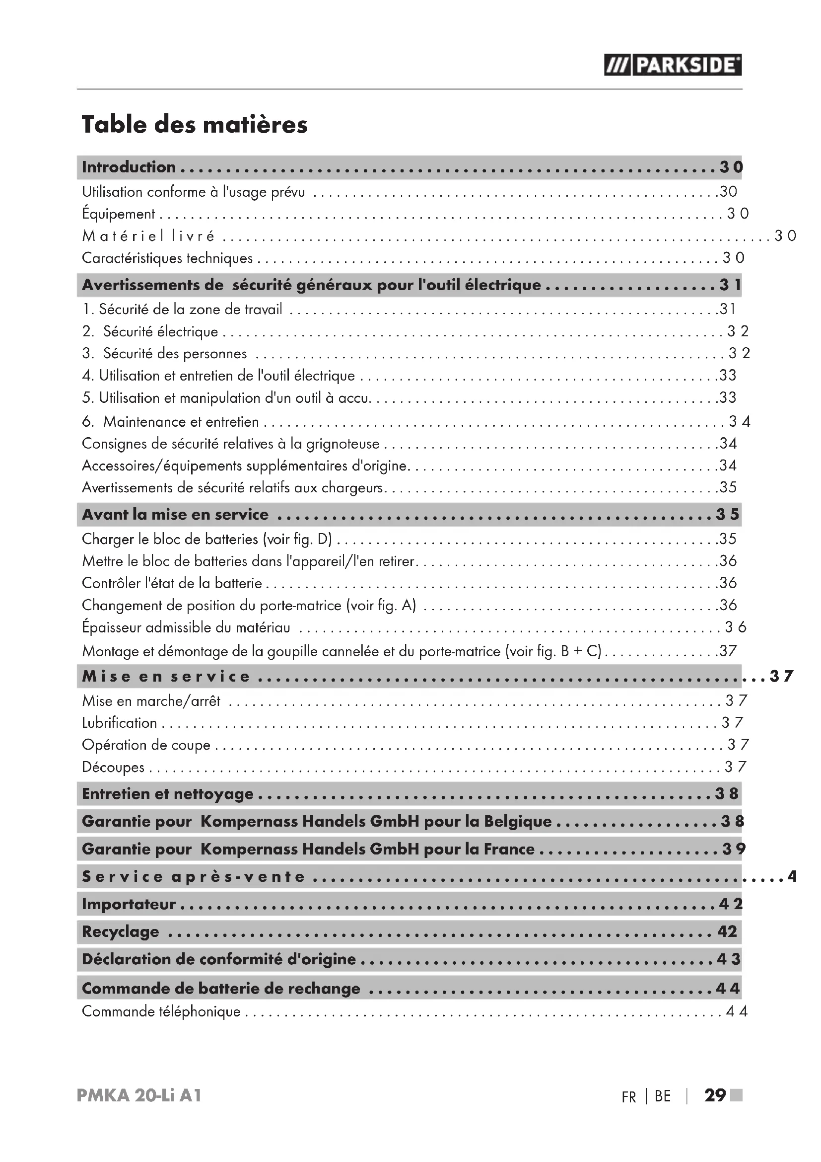 a) Faire entretenir l'outil électrique par un répa- rateur qualifié utilisant uniquement des pièces de rechange identiques. Cela assurera que la sécurité de l'outil est maintenue. b) Ne jamais entretenir des batteries endomma- gées. L'entretien des batteries ne doit être effectué que par le constructeur ou des points de service après-vente agréés. Consignes de sécurité relatives àlagrignoteuse ■ Tenez fermement l'outil. ■ Sécurisez parfaitement la pièce à usiner. ■ Tenez les mains éloignées des pièces en rotation. ■ Les arêtes et les copeaux de la pièce à usiner sont tranchants. Portez des gants. Pour éviter toute blessure il est également recommandé de porter des chaussures à semelles épaisses. ■ Ne posez pas l'outil sur les copeaux de la pièce. Vous risquez de détériorer l'outil ou de provoquer des dysfonctionnements. ■ Ne laissez pas fonctionner l'outil sans surveil- lance. Utilisez l'appareil uniquement en le tenant en main. ■ Veillez toujours à vous tenir bien équilibre. Lors de l'utilisation de l'outil à des postes de travail situés en hauteur, assurez-vous que personne ne se tienne en dessous. ■ Évitez tout contact avec la goupille cannelée, la matrice ou la pièce à usiner juste après l'usinage, ces pièces risquant d'être encore très chaudes et de causer des brûlures cutanées. ■ Évitez de couper des câbles électriques. Cela peut entraîner des accidents graves dus à une décharge électrique. Accessoires/équipements supplémentaires d'origine ■ Utilisez uniquement les accessoires et équipe- ments supplémentaires spécifiés dans le mode d'emploi ou dont le logement est compatible avec l'appareil. AVERTISSEMENT ! ■ N'utilisez aucun accessoire qui n'a pas été recommandé par PARKSIDE. Cela peut entraîner une électrocution et un incendie.PMKA 20-Li A1