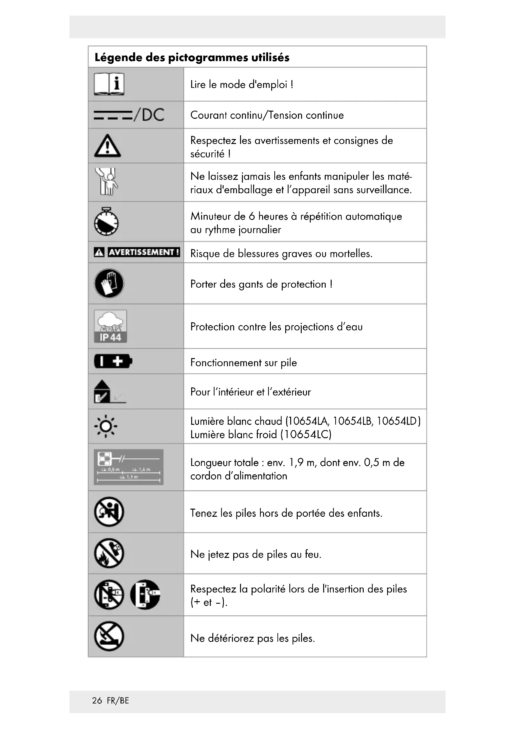 Légende des pictogrammes utilisés ..................... Page 26 Introduction ..............................................................................Page 28 Utilisation conforme ....................................................................... Page 28 Descriptif des éléments .................................................................. Page 28 Caractéristiques techniques ...........................................................Page 28 Contenu de la livraison ..................................................................Page 28 Consignes de sécurité ......................................................Page 29 Planter les bâtons LED dans le sol .................................................Page 30 Insérer/remplacer les piles ............................................................Page 30 Allumer/éteindre les bâtons lumineux LED ...................................Page 31 Nettoyage et entretien ...................................................Page 31 Mise au rebut ..........................................................................Page 31 Garantie et service après-vente .............................Page 32 Adresse du service après-vente .....................................................Page 33 Fabricant .........................................................................................Page 3326 FR/BE Légende des pictogrammes utilisés Lire le mode d'emploi! Courant continu/Tension continue Respectez les avertissements et consignes de sécurité ! Ne laissez jamais les enfants manipuler les maté- riaux d'emballage et l’appareil sans surveillance. Minuteur de 6 heures à répétition automatique au rythme journalier Risque de blessures graves ou mortelles. Porter des gants de protection! Protection contre les projections d’eau Fonctionnement sur pile Pour l‘intérieur et l‘extérieur Lumière blanc chaud ( 10654LA, 10654LB, 10654LD