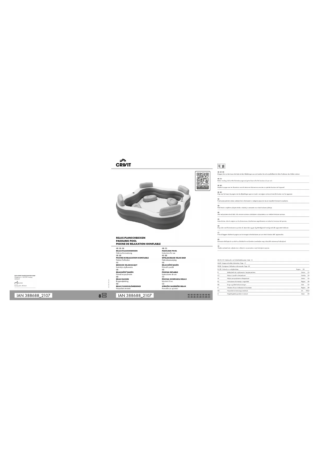 - s‘il présente les qualités qu‘un acheteur peut légitimement attendre eu égard aux déclara- tions publiques faites par le vendeur, par le producteur ou par son représentant, notam- ment dans la publicité ou l‘étiquetage ; 2° Ou s‘il présente les caractéristiques définies d‘un commun accord par les parties ou être propre à tout usage spécial recherché par l‘acheteur, porté à la connaissance du vendeur et que ce dernier a accepté. Article L217-12 du Code de la consommation L‘action résultant du défaut de conformité se prescrit par deux ans à compter de la délivrance du bien.26 Article 1641 du Code civil Le vendeur est tenu de la garantie à raison des défauts cachés de la chose vendue qui la rendent impropre à l‘usage auquel on la destine, ou qui diminuent tellement cet usage que l‘acheteur ne l‘aurait pas acquise, ou n‘en aurait donné qu‘un moindre prix, s‘il les avait connus. Article 1648 1er alinéa du Code civil L‘action résultant des vices rédhibitoires doit être intentée par l‘acquéreur dans un délai de deux ans à compter de la découverte du vice. Les pièces détachées indispensables à l’utili- sation du produit sont disponibles pendant la durée de la garantie du produit. IAN : 388688_2107 Service France Tel. : 0800 919270 E-Mail : deltasport@lidl.fr Service Belgique Tel. : 070 270 171 (0,15 EUR/Min.) E-Mail : deltasport@lidl.be FR/BE27FR/BE Décolorations et causes possibles Malgré l’utilisation de matériaux performants et en prenant toutes les précautions citées ci-dessus, des phénomènes exceptionnels peuvent se produire en raison du vieillissement. Il est important de se rappeler que la couche de revêtement se décolore progressivement en raison du vieillissement et des rayons UV. Les causes suivantes peuvent provoquer une décoloration prématurée : — Utilisation de produits inadaptés et de procédures de traitement de l’eau qui ne sont pas conformes aux recommandations du fabricant ; — Une action mécanique excessive (bassins avec des marées, couches de glace flottantes, nettoyeurs automatiques et brosses, etc.) ; — Haute température de l’eau ; — Influence des matériaux et du processus de fabrication. Parfois, une légère différence de couleur apparaît entre les zones immergées dans l’eau et les zones situées au-dessus du niveau de l’eau. Ce phénomène arrive couramment. Taches et causes possibles En raison des nombreuses influences mentionnées ci-dessus, il est extrêmement difficile de déterminer les causes des taches. Les taches qui apparaissent au-dessus de la ligne de flottaison sont rarement présentes en profondeur de la couche de revêtement. Le tableau suivant indique les causes possibles des taches lorsque la mini-piscine fonctionne normalement. Pour trouver les causes possibles, il est utile d’effectuer les mesures décrites dans le tableau ci-dessous. Si elles n’aboutissent pas, il est possible que des influences du processus de fabrication soient responsables. Type de tache Cause possible Solution possible Taches blanchâtres au fond de la mini-piscine Traitement inapproprié de l’eau. Les taches sont irréversibles et ne peuvent être réparées. Décomposition de matières organiques (humus, brindilles, feuilles) qui sont en contact direct avec la couche de revêtement. L’effet est plus prononcé si le contact a eu lieu pendant une longue période. Taches blanchâtres au fond de la mini-piscine et sur les parois Concentration excessive de produits chimiques. Les taches sont irréversibles et ne peuvent être réparées. Taches blanchâtres sur la ligne de flottaison Dépôts de calcaire Ces dépôts peuvent être évités en utilisant des agents séquestrants du calcaire et en maintenant l’équilibre du pH. Le nettoyage est possible avant l’application de cette mesure en utili- sant un produit approprié, sans solvant et non abrasif et en veillant à ne pas rayer la couche. Pour réduire ce phénomène, la dureté de l'eau doit être contrôlée régulièrement, par exemple avec un échangeur d’ions préinstallé. Produits chimiques non-adaptés et/ou nettoyants abrasifs Zones laiteuses ou blanchies irréversibles et non traitées. Présence d’algues. Peut être évité par un entretien régulier de la mini-piscine (net- toyage). Décomposition de la matière organique (feuilles, impuretés, végétation). Utilisation du sulfate de cuivre sous forme pure ou mélangée et application de l’alliage Cu/Ag. Irréversible. Ces produits ne sont pas autorisés dans ce type de mini-piscine. Crème solaire ou cosmétique flottant à la surface de l’eau, combustion d'hydrocarbures provenant de feux de bois ou de charbon de bois, gaz d’échappement des voitures, gaz d'échappement des avions ou toute autre pollution provenant de l’environnement direct ou indirect de la mini-piscine. Peut être évité par un entretien régulier de la mini-piscine (net- toyage). Taches vertes D’origine organique, ces taches n’apparaissent qu’en présence d’organismes vivants (algues, champignons, etc.) et peuvent être liées à une perturbation mani- feste de l’équilibre du traitement de l’eau. Peut être évité par un entretien régulier de la mini-piscine (net- toyage). Taches roses Se trouvent généralement sur les pièces d’étanchéité, sont causées par des bactéries se développant sur les composants de ces pièces en plastique et peuvent être liées au traitement de l’eau. Si du PHMB est utilisé pour la désinfection, il risque de se former des taches roses en cas de présence de cuivre. Peut être évité par un entretien régulier de la mini-piscine (net- toyage).28 NL/BE Gefeliciteerd! Met uw aankoop hebt u voor een hoogwaardig artikel gekozen. Zorg ervoor dat u voor het eerste gebruik met het artikel vertrouwd raakt. Lees hiervoor de volgende ge- bruiksaanwijzing zorgvuldig door. Gebruik het artikel alleen zoals omschreven en