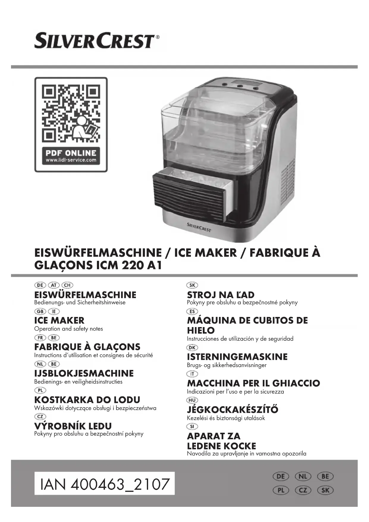 IAN 400463_2107) available as proof of purchase. You will find the item number on the rating plate, an engraving, on the front page of the instructions for use (bottom left), or as a sticker on the rear or bottom of the product. If functional or other defects occur, please contact the service department listed either by telephone or by e-mail. You can return a defective product to us free of charge to the service address that will be provided to you. Ensure that you enclose the proof of purchase (till receipt) and information about what the defect is and when it occurred. Service Service Great Britain Tel.: 08000569216 E-Mail: owim@lidl.co.uk Service Ireland Tel.: 1800 200736 E-Mail: owim@lidl.ie29FR/BE Avertissements et symboles utilisés.................................. Page 30 Introduction ............................................................. Page 31 Utilisation conforme aux prescriptions ........................................... Page 31 Contenu de l'emballage...................................................... Page 31 Description des pièces ....................................................... Page 31 Données techniques......................................................... Page 31 Consignes de sécurité .................................................. Page 32 Avant la première utilisation.......................................... Page 35 Fonctionnement ......................................................... Page 35 Remplir le réservoir d’eau .................................................... Page 35 Fabrication de glaçons....................................................... Page 35 Remplir le réservoir d’eau .................................................... Page 36 Fonction d'auto-nettoyage .................................................... Page 36 Vider l’eau du réservoir d’eau ................................................. Page 36 Dépannage .............................................................. Page 37 Nettoyage et entretien ................................................ Page 38 Rangement .............................................................. Page 38 Transport ................................................................ Page 38 Mise au rebut............................................................ Page 39 Garantie ................................................................. Page 40 Faire valoir sa garantie ...................................................... Page 41 Service après-vente .................................................... Page 4130 FR/BE Avertissements et symboles utilisés Les avertissements suivants sont utilisés dans ce mode d’emploi et sur l’emballage: Lire les instructions Courant alternatif/tension alternative DANGER! Ce symbole avec ce signal important de «Danger» indique un danger avec un risque élevé de blessures graves ou de mort si la situation dangereuse n’est pas évitée. Hertz (fréquence du secteur) AVERTISSEMENT! Ce symbole avec ce signal important d'«Avertissement» indique un danger avec un risque moyen de blessures graves ou de mort si la situation dangereuse n'est pas évitée. Watt Symbole pour terre de protection PRUDENCE! Ce symbole avec ce signal important de «Prudence» indique un danger avec un risque faible de blessures légères à importantes si la situation dangereuse n'est pas évitée. Utilisez le produit seulement à l’intérieur de locaux secs. Danger– risque d'électrocution! ATTENTION! Ce symbole avec la mention «Attention» indique un possible risque de dégâts matériels. AVERTISSEMENT! Risque d’incendie/ substances inflammables. REMARQUE: Ce symbole avec ce signal important de «Remarque» propose plus d'informations utiles. Convient pour les aliments Ce produit n'a aucune influence négative sur le goût ou l'odeur. Le sigleCE confirme la conformité aux directives de l'UE applicables au produit. Ne plongez le bloc moteur du produit dans aucun liquide. Ne laissez aucun liquide pénétrer dans le boîtier du bloc moteur.31FR/BE