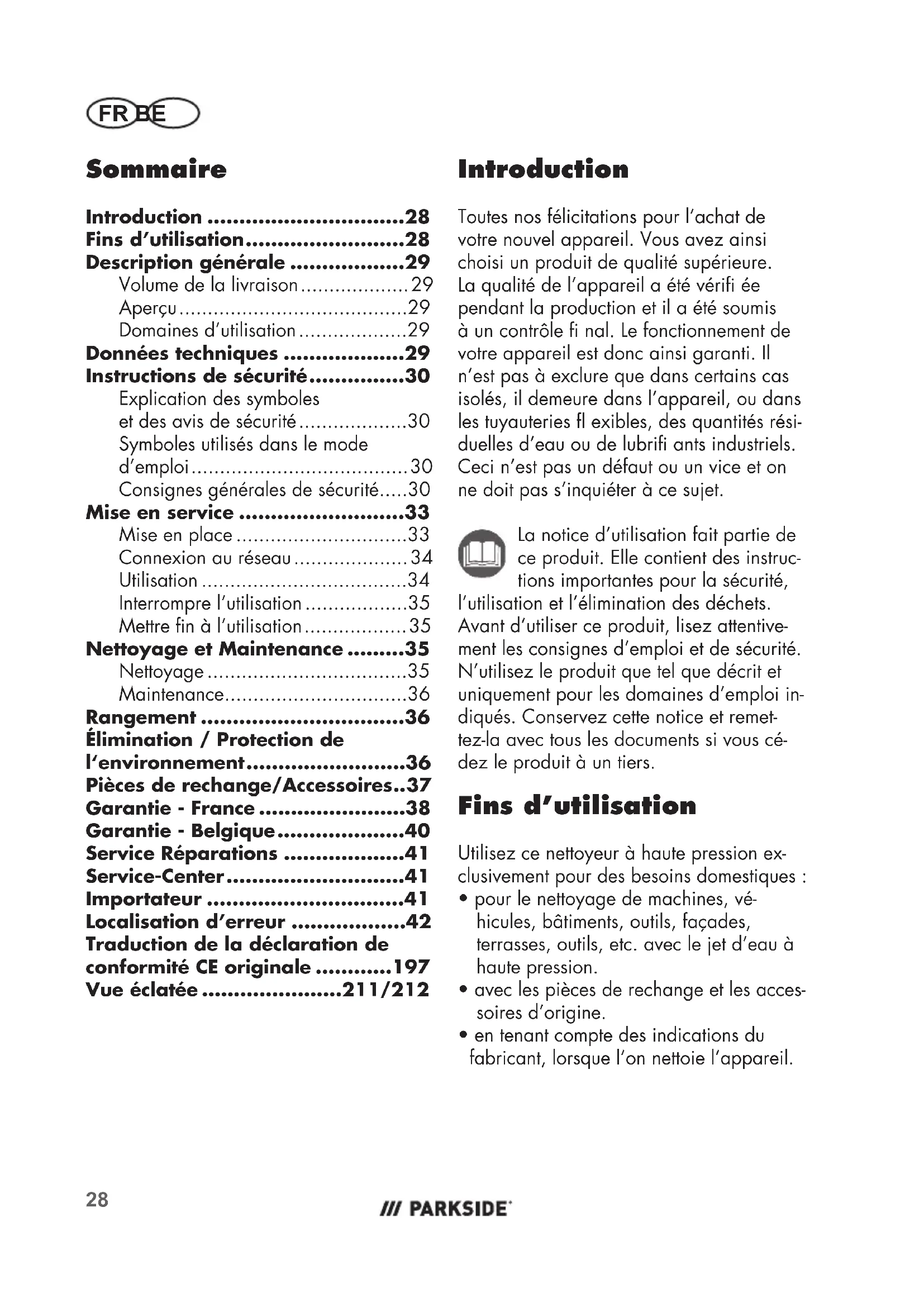 - en tenant compte des indications du fabricant, lorsque l’on nettoie l’appareil. Sommaire Introduction ...............................28 Fins d’utilisation .........................28 Description générale ..................29 Volume de la livraison ................... 29 Aperçu ........................................29 Domaines d’utilisation ...................29 Données techniques ...................29 Instructions de sécurité ...............30 Explication des symboles et des avis de sécurité ...................30 Symboles utilisés dans le mode d’emploi ...................................... 30 Consignes générales de sécurité .....30 Mise en service ..........................33 Mise en place ..............................33 Connexion au réseau .................... 34 Utilisation ....................................34 Interrompre l’utilisation ..................35 Mettre n à l’utilisation .................. 35 Nettoyage et Maintenance .........35 Nettoyage ...................................35 Maintenance ................................36 Rangement ................................36 Élimination / Protection de l‘environnement .........................36 Pièces de rechange/Accessoires .. 37 Garantie - France .......................38 Garantie - Belgique ....................40 Service Réparations ...................41 Service-Center ............................41 Importateur ...............................41 Localisation d’erreur ..................42 Traduction de la déclaration de conformité CE originale ............197 Vue éclatée ......................211/212BEFR