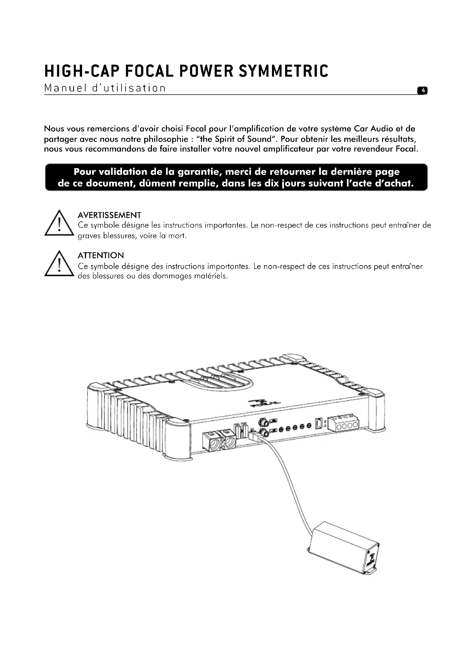 Nous vous remercions d’avoir choisi Focal pour l’amplification de votre système Car Audio et de partager avec nous notre philosophie : “the Spirit of Sound”. Pour obtenir les meilleurs résultats, nous vous recommandons de faire installer votre nouvel amplificateur par votre revendeur Focal. Pour validation de la garantie, merci de retourner la dernière page de ce document, dûment remplie, dans les dix jours suivant l’acte d’achat. AVERTISSEMENT Ce symbole désigne les instructions importantes. Le non-respect de ces instructions peut entraîner de graves blessures, voire la mort. ATTENTION Ce symbole désigne des instructions importantes. Le non-respect de ces instructions peut entraîner des blessures ou des dommages matériels.HiGH-cap focal power Symmetric Manuel d'utilisation