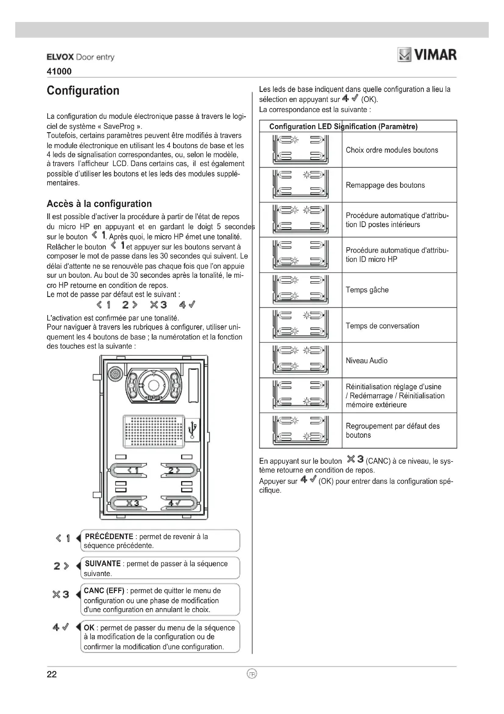 ENLes leds de base indiquent dans quelle conguration a lieu la sélection en appuyant sur (OK). La correspondance est la suivante : Conguration LED Signication (Paramètre) Choix ordre modules boutons Remappage des boutons Procédure automatique d'attribu- tion ID postes intérieurs Procédure automatique d'attribu- tion ID micro HP Temps gâche Temps de conversation Niveau Audio Réinitialisation réglage d’usine / Redémarrage / Réinitialisation mémoire extérieure Regroupement par défaut des boutons En appuyant sur le bouton (CANC) à ce niveau, le sys- tème retourne en condition de repos. Appuyer sur (OK) pour entrer dans la conguration spé- cique. Conguration La conguration du module électronique passe à travers le logi- ciel de système « SaveProg ». Toutefois, certains paramètres peuvent être modiés à travers le module électronique en utilisant les 4 boutons de base et les 4 leds de signalisation correspondantes, ou, selon le modèle, à travers l’afcheur LCD. Dans certains cas, il est également possible d’utiliser les boutons et les leds des modules supplé- mentaires. Accès à la conguration Il est possible d’activer la procédure à partir de l'état de repos du micro HP en appuyant et en gardant le doigt 5 secondes sur le bouton . Après quoi, le micro HP émet une tonalité. Relâcher le bouton et appuyer sur les boutons servant à composer le mot de passe dans les 30 secondes qui suivent. Le délai d'attente ne se renouvèle pas chaque fois que l'on appuie sur un bouton. Au bout de 30 secondes après la tonalité, le mi- cro HP retourne en condition de repos. Le mot de passe par défaut est le suivant : L'activation est conrmée par une tonalité. Pour naviguer à travers les rubriques à congurer, utiliser uni- quement les 4 boutons de base ; la numérotation et la fonction des touches est la suivante : PRÉCÉDENTE : permet de revenir à la séquence précédente. SUIVANTE : permet de passer à la séquence suivante. CANC (EFF) : permet de quitter le menu de configuration ou une phase de modification d'une configuration en annulant le choix. OK : permet de passer du menu de la séquence à la modification de la configuration ou de confirmer la modification d'une configuration.