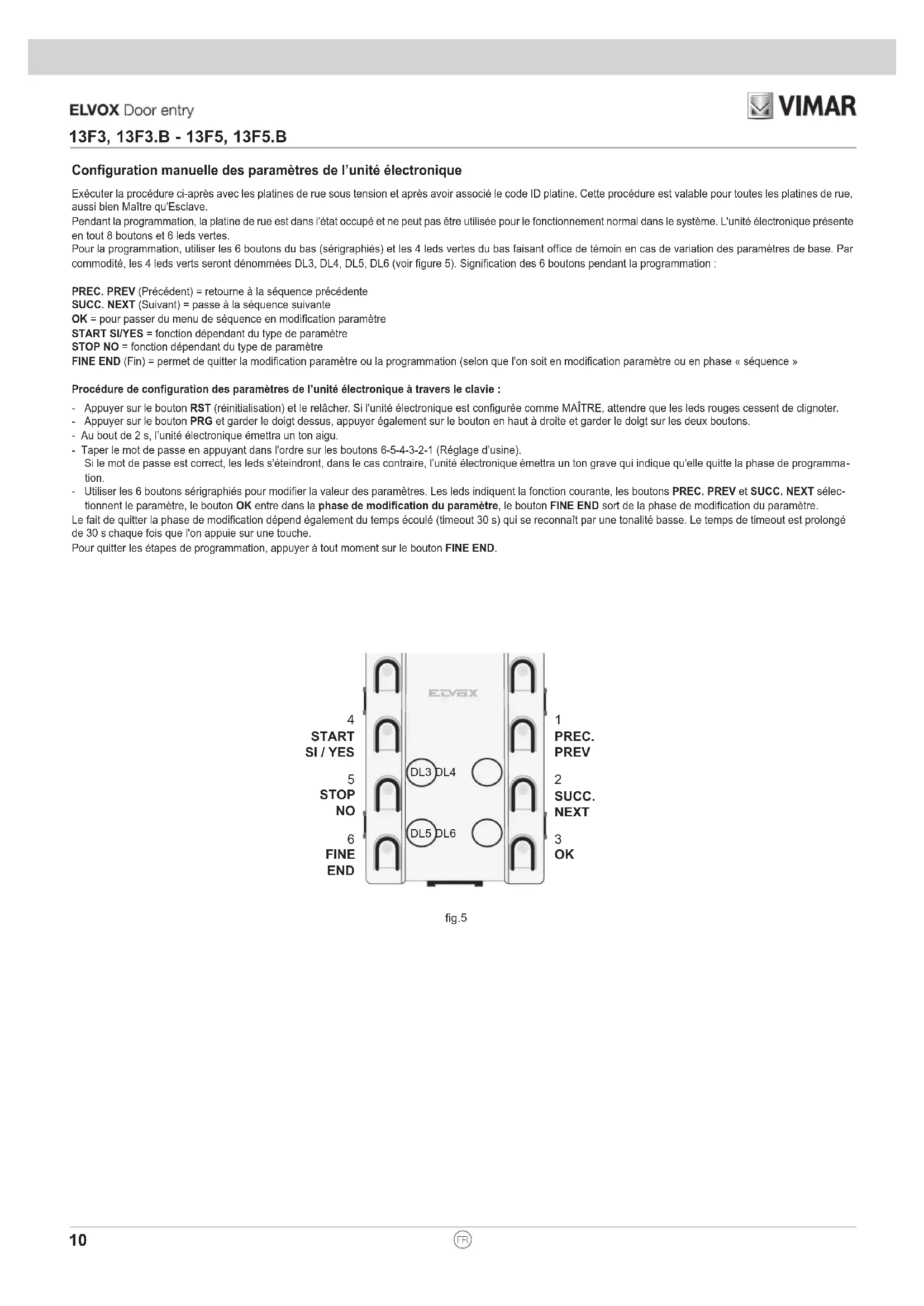 13F3, 13F3.B - 13F5, 13F5.BConfiguration manuelle des paramètres de l’unité électronique Exécuter la procédure ci-après avec les platines de rue sous tension et après avoir associé le code ID platine. Cette procédure est valable pour toutes les platines de rue, aussi bien Maître qu'Esclave. Pendant la programmation, la platine de rue est dans l'état occupé et ne peut pas être utilisée pour le fonctionnement normal dans le système. L'unité électronique présente en tout 8 boutons et 6 leds vertes. Pour la programmation, utiliser les 6 boutons du bas (sérigraphiés) et les 4 leds vertes du bas faisant office de témoin en cas de variation des paramètres de base. Par commodité, les 4 leds verts seront dénommées DL3, DL4, DL5, DL6 (voir figure 5). Signification des 6 boutons pendant la programmation : PREC. PREV (Précédent) = retourne à la séquence précédente SUCC. NEXT (Suivant) = passe à la séquence suivante OK = pour passer du menu de séquence en modification paramètre START SI/YES = fonction dépendant du type de paramètre STOP NO = fonction dépendant du type de paramètre FINE END (Fin) = permet de quitter la modification paramètre ou la programmation (selon que l'on soit en modification paramètre ou en phase « séquence » Procédure de configuration des paramètres de l’unité électronique à travers le clavie : - Appuyer sur le bouton RST (réinitialisation) et le relâcher. Si l'unité électronique est configurée comme MAÎTRE, attendre que les leds rouges cessent de clignoter. - Appuyer sur le bouton PRG et garder le doigt dessus, appuyer également sur le bouton en haut à droite et garder le doigt sur les deux boutons. - Au bout de 2 s, l’unité électronique émettra un ton aigu. - Taper le mot de passe en appuyant dans l'ordre sur les boutons 6-5-4-3-2-1 (Réglage d’usine). Si le mot de passe est correct, les leds s'éteindront, dans le cas contraire, l’unité électronique émettra un ton grave qui indique qu'elle quitte la phase de programma