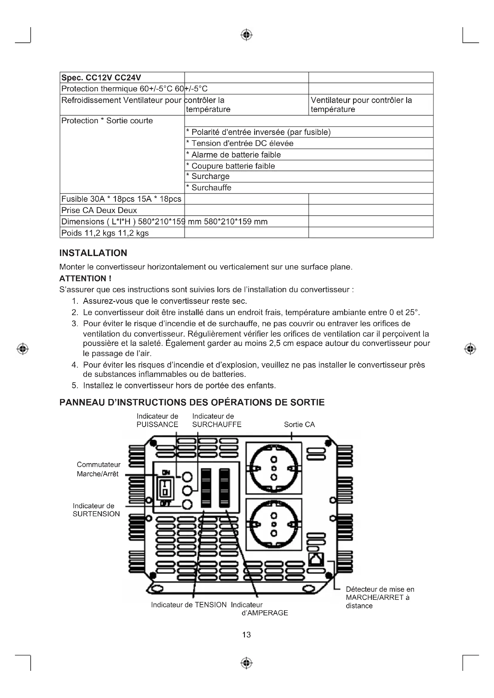 - Surchauffe Fusible 30A * 18pcs 15A * 18pcs Prise CA Deux Deux Dimensions ( L*l*H ) 580*210*159 mm 580*210*159 mm Poids 11,2 kgs 11,2 kgs INSTALLATION Monter le convertisseur horizontalement ou verticalement sur une surface plane. ATTENTION ! S’assurer que ces instructions sont suivies lors de l’installation du convertisseur :