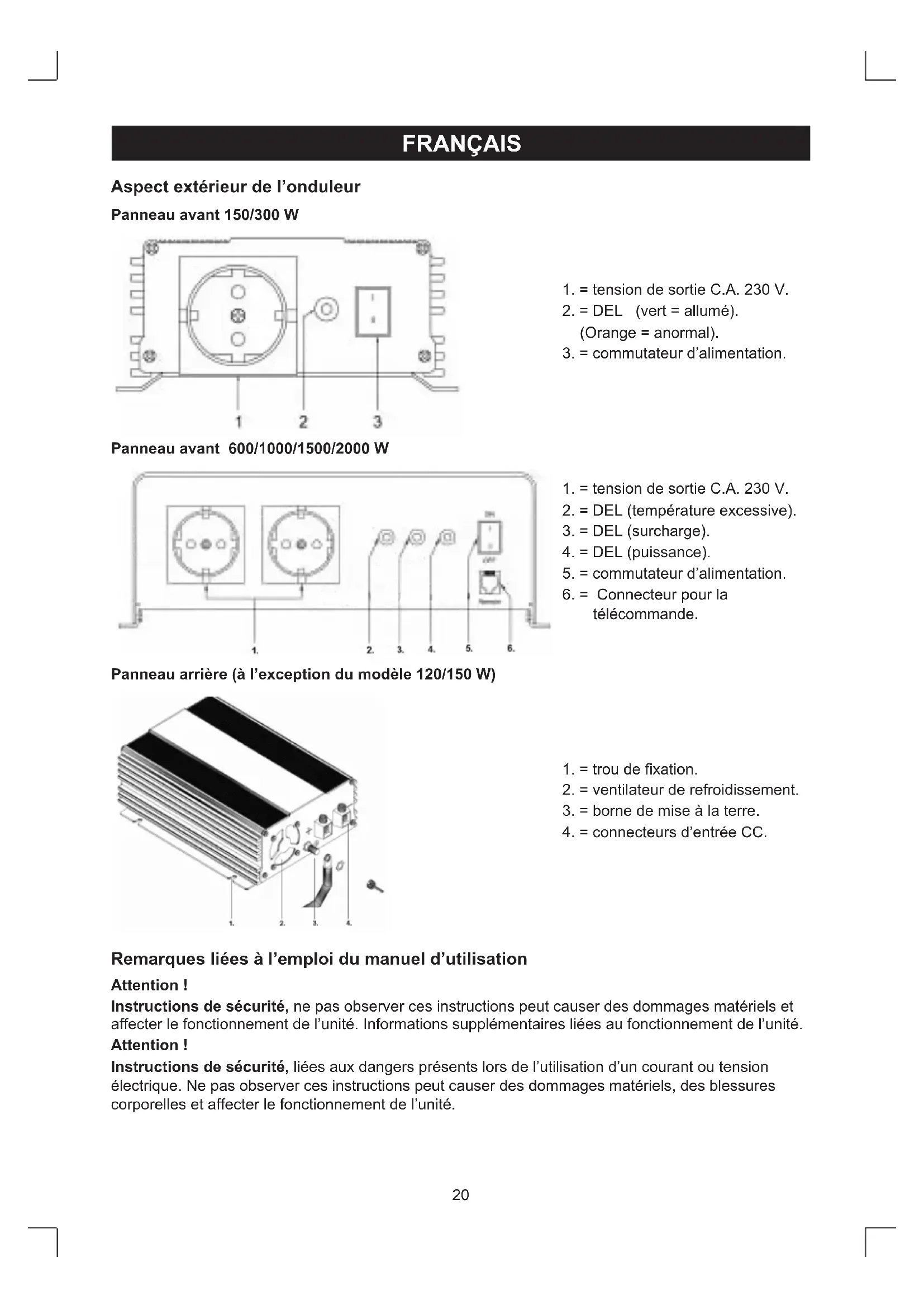 Attention ! Touteinversiondepolaritédeslsdelabatteriepeutendommagerl’onduleur.Neraccordezpas l’onduleuràunsystèmeélectriqueavecmiseàlaterrepositive. Mode opératoire de l’onduleur Modèles de 120/150/300/600 W : Raccordezseulementunéquipementauconnecteur230Vsituésurlepanneauavantdel’unité. Modèles de 600 W et plus : Raccordezseulementunnombremaximaldedeuxéquipementsàchaqueconnecteur230Vsituésur le panneau avant de l’unité. Mise en marche Pourmettreenmarchel’unité,utilisezlecommutateurMARCHE/ARRETsituésurlepanneauavant del’unité.Lorsquel’unitéestenmarche,letémoinlumineux«Alimentation»s’illumine.23 Disfonctionnements 120/150/300 W Lorsquelatensiondelabatteriechuteendessousde10,7V(modèlesde12V)ou21,4V(modèles de24V),letémoinlumineuxs’allumeenorange.Ceciseproduitégalementlorsd’unesurchauffe. L’onduleurs’éteintautomatiquementlorsquelatensiondelabatteriechuteendessousde10V(pour les modèles de 12 V) ou 20 V (pour les modèles de 24 V).