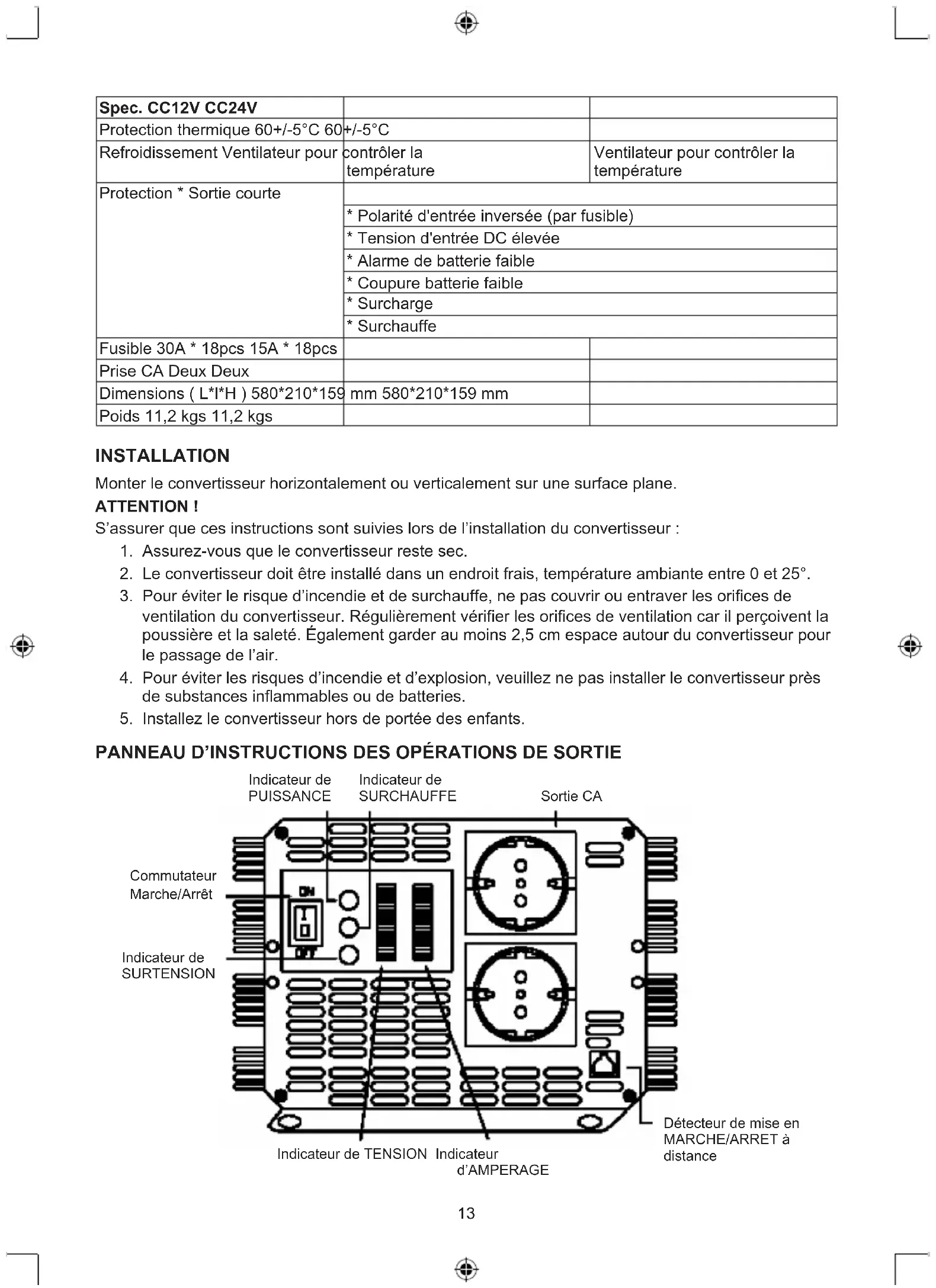- Surchauffe Fusible 30A * 18pcs 15A * 18pcs Prise CA Deux Deux Dimensions ( L*l*H ) 580*210*159 mm 580*210*159 mm Poids 11,2 kgs 11,2 kgs INSTALLATION Monter le convertisseur horizontalement ou verticalement sur une surface plane. ATTENTION ! S’assurer que ces instructions sont suivies lors de l’installation du convertisseur :
