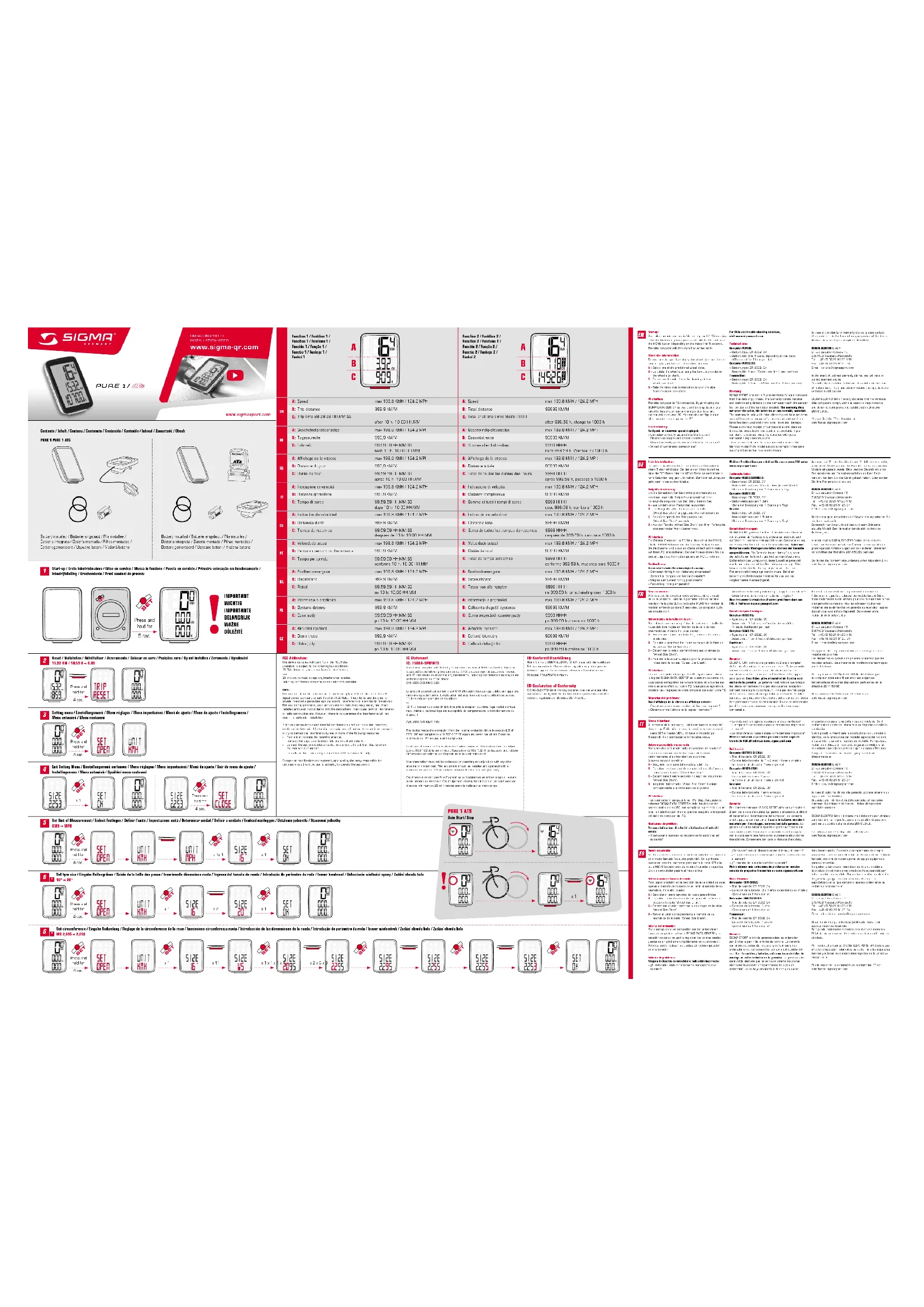 Mise en service : A la livraison, le compteur cycle se trouve dans un état de veille profonde. Lors de la première mise en service, maintenir la touche SET ou la touche MENU (en fonction du modèle) enfoncée pendant 5 secondes. Le compteur cycle est ensuite actif. Détermination de la taille des roues : Pour obtenir une mesure précise de la vitesse, la taille des roues doit être réglée en fonction de la taille de vos pneumatiques. A cette fin, vous pouvez : A – Sélectionner parmi une liste de grandeurs des roues prédéfinies. B – Calculer la grandeur des roues au moyen de la formule du tableau “Wheel Size Chart”. C – Déterminer la valeur conformément aux schémas du “Wheel Size Chart”. D – Reprendre la valeur adéquate pour la grandeur de vos roues dans le tableau “Wheel Size Chart”. PC Interface : Le compteur cycle est compatible PC. Après avoir acheté le logiciel SIGMA DATA CENTER et la station de connexion, vous pouvez enregistrer les valeurs totales et actuelles ais- ément et sans effort sur votre PC. Vous pouvez également procéder aux réglages de votre compteur cycle sur votre PC. Résolution des problèmes : Pas d‘affichage de la vitesse ou affichage erroné : – Compteur correctement enclenché dans son support ? – Distance entre l‘aimant et le capteur correcte ? – Aimant correctement positionné par rapport au capteur ? – Circonférence de la roue correctement réglée ? Vous trouverez la résolution d‘autres problèmes dans nos FAQ, à l‘adresse www.sigmasport.com Caractéristiques techniques : Compteur AVEC FIL: – Type de pile : CR 2032, 3V – Autonomie : 3 à 4 ans, en fonction des modèles (1 heure d‘utilisation par jour) Compteur SANS FIL: – Type de pile : CR 2032, 3V – Autonomie : 1 an (1 heure d‘utilisation par jour) Emetteur : – Type de pile : CR 2032, 3V – Autonomie : 1,5 an (1 heure d‘utilisation par jour) Garantie : SIGMA SPORT octroie une garantie de 2 ans à compter de la date d‘achat sur tous ses compteurs. Cette garantie couvre les défauts matériels et de fabrication sur le compteur lui-même, le capteur / l‘émetteur et le support pour guidon. Les câbles, piles et matériel de fixation sont exclus de la garantie. La garantie n‘est valable que lorsque les pièces concernées n‘ont pas été ouvertes (exception: compartiment à pile du compteur), il n‘a pas été fait usage de la force et aucun dommage volontaire n‘existe. Veuillez conserver soigneusement la preuve d‘achat car celle-ci devra être présentée en cas de réclamation. En cas de réclamation justifiée, nous vous enverrons un appareil de rechange comparable. Il n‘existe aucun droit au remplacement du modèle à l‘identique lorsque la production du modèle faisant l‘objet d‘une réclamation a été arrêtée pour des raisons liées à des changements de modèle. Veuillez adresser toutes vos réclamations et demandes en garantie au revendeur auprès duquel vous avez acheté l‘appareil. Ou envoyer votre réclamation directement à : SIGMA-ELEKTRO GmbH Dr.-Julius-Leber-Strasse 15 D-67433 Neustadt/Weinstraße Tél.: +49-(0) 63 21-91 20-1 18 Fax: +49-(0) 63 21-91 20-34 E-mail: service@sigmasport.com Un appareil de remplacement vous sera envoyé si votre requête est justifiée. Les demandes en garantie ne peuvent concerner que les modèles actuels. Sous réserve de modifications techniques par le fabricant. Par la présente, SIGMA-ELEKTRO GmbH déclare que le compteur cycle sans fil satisfait aux exigences fondamentales et autres dispositions pertinentes de la directive 2014/53/UE. Vous trouverez la déclaration CE à l’adresse : certificates.sigmasport.com