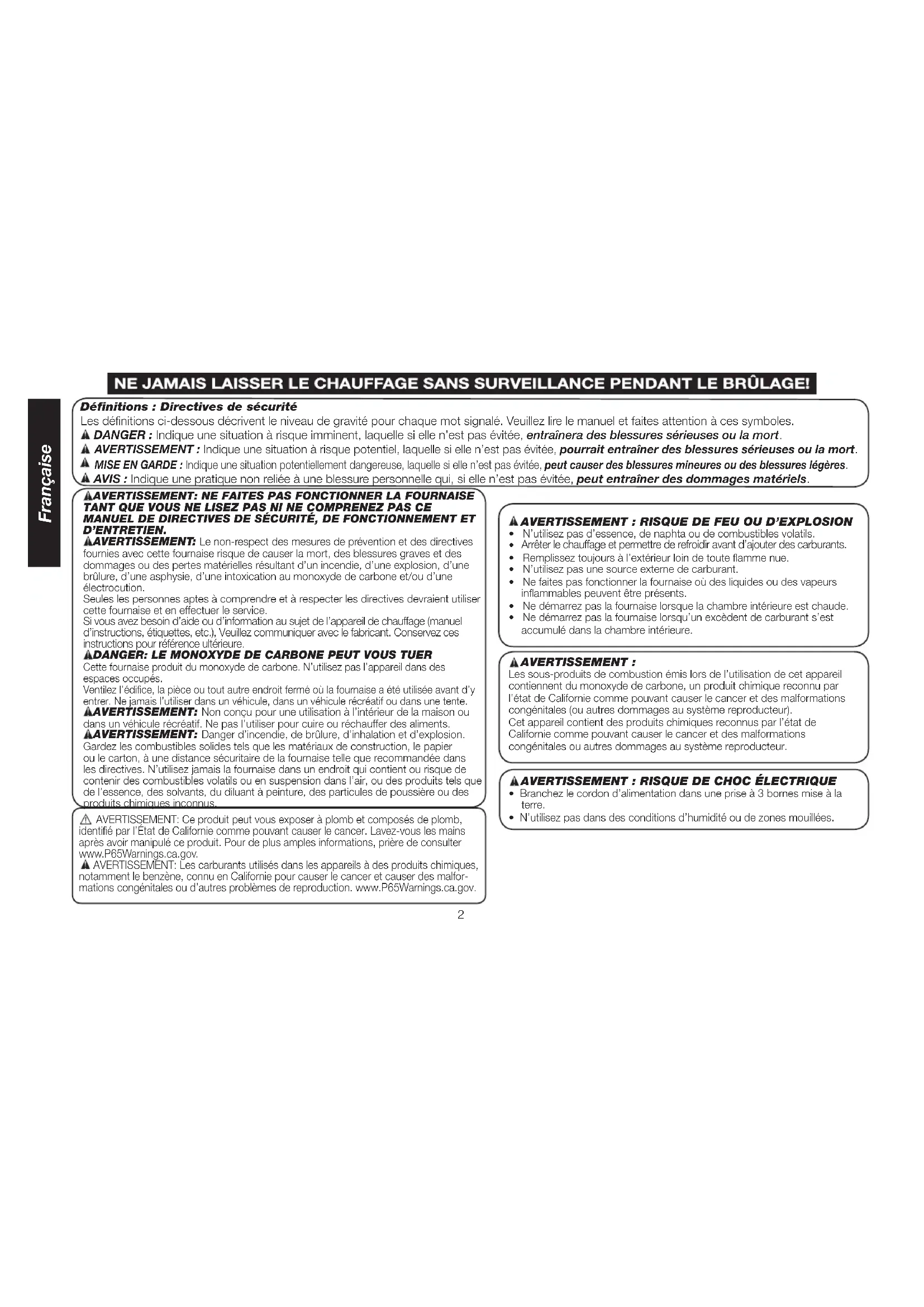 Cette fournaise produit du monoxyde de carbone. N’utilisez pas l’appareil dans des espaces occupés. Ventilez l’édice, la pièce ou tout autre endroit fermé où la fournaise a été utilisée avant d’y entrer. Ne jamais l’utiliser dans un véhicule, dans un véhicule récréatif ou dans une tente.
