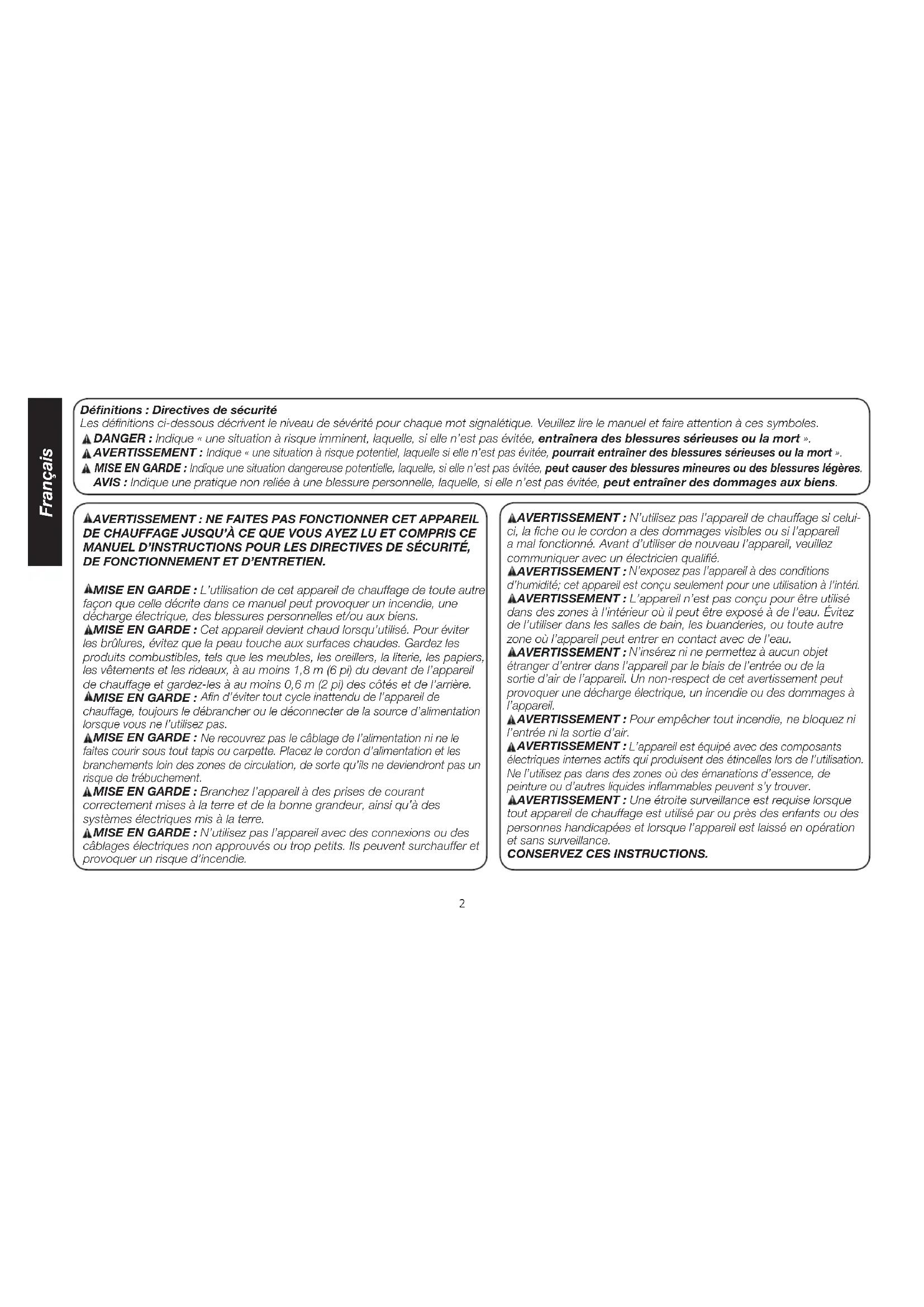 tout appareil de chauffage est utilisé par ou près des enfants ou des personnes handicapées et lorsque l’appareil est laissé en opération et sans surveillance. CONSERVEZ CES INSTRUCTIONS.