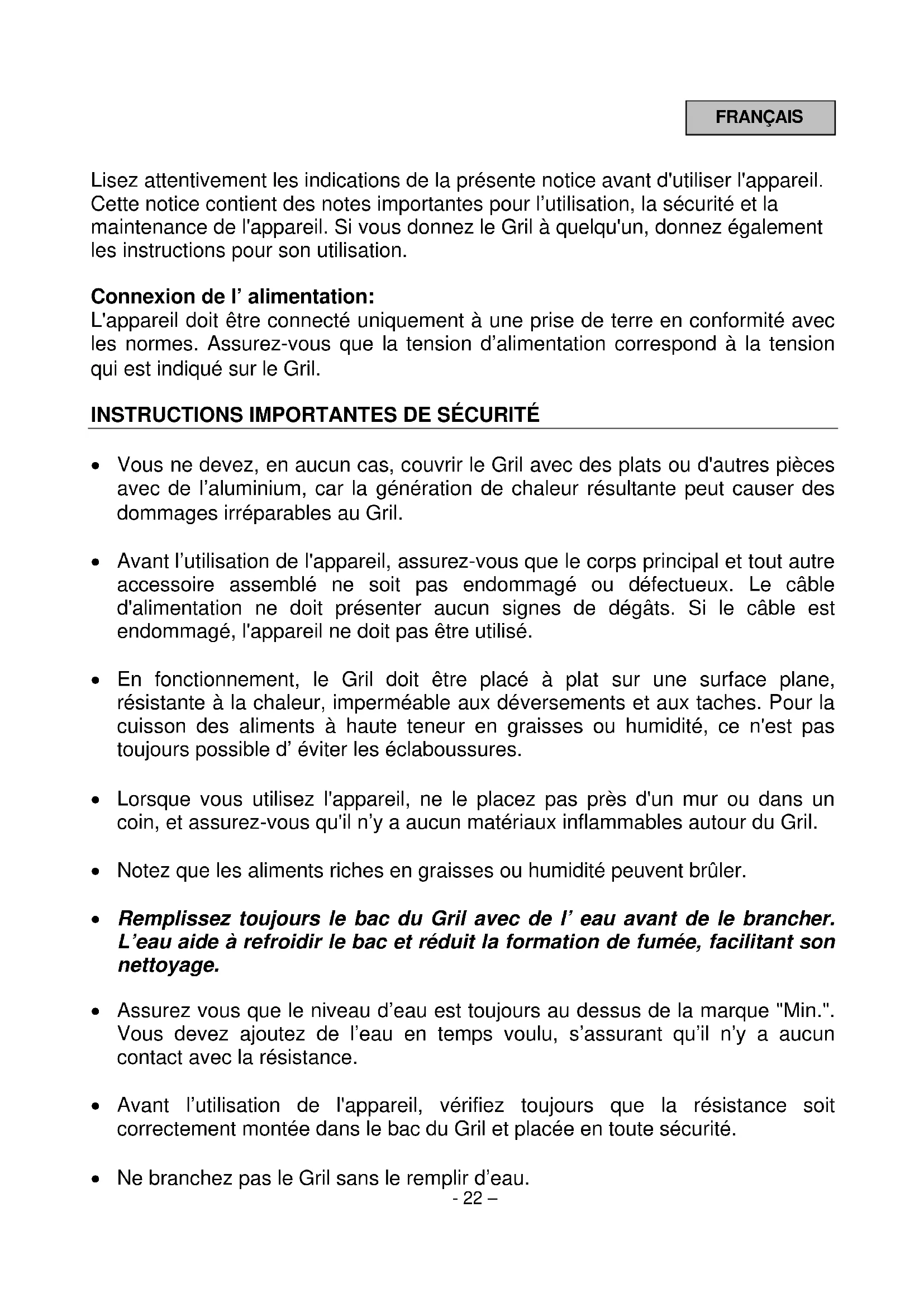 - Ne branchez pas le Gril sans le remplir d’eau. - 22 – FRANÇAIS• Lorsque le Gril est branché, il doit toujours être surveillé.