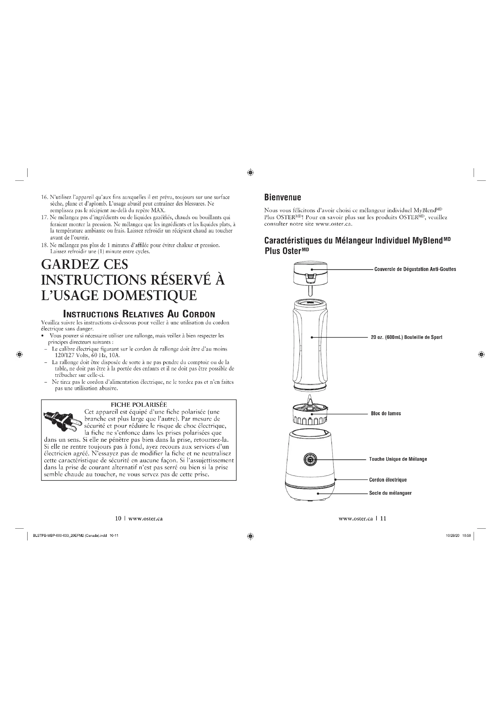 tourne lorsque le moteur est mis en MARCHE, ÉTEIGNEZ aussitôt l’appareil et serrez le récipient dans la base filetée. BLSTPB-MBP-000-033_20EFM2 (Canada).indd 8-9BLSTPB-MBP-000-033_20EFM2 (Canada).indd 8-9 10/28/20 10:5910/28/20 10:5910 | www.oster.ca16. N’utilisez l’appareil qu’aux fins auxquelles il est prévu, toujours sur une surface sèche, plane et d’aplomb. L’usage abusif peut entraîner des blessures. Ne remplissez pas le récipient au-delà du repère MAX.17. Ne mélangez pas d’ingrédients ou de liquides gazéifiés, chauds ou bouillants qui feraient monter la pression. Ne mélangez que les ingrédients et les liquides plats, à la température ambiante ou frais. Laissez refroidir un récipient chaud au toucher avant de l’ouvrir.18. Ne mélangez pas plus de 1 minutes d’affilée pour éviter chaleur et pression. Laissez refroidir une (1) minute entre cycles. GARDEZ CES