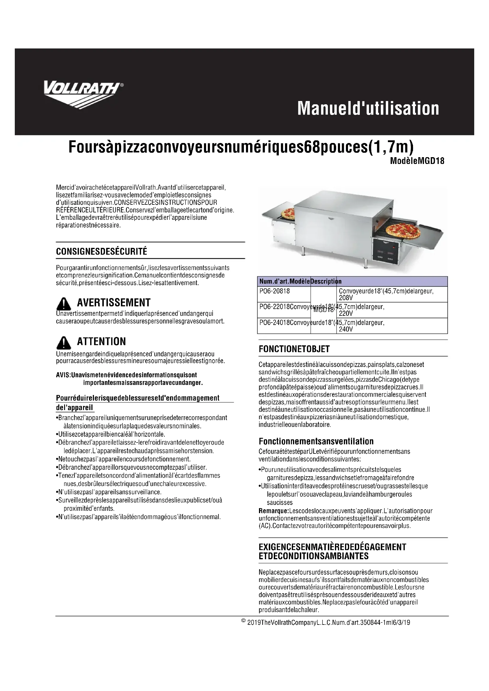 Ne placez pas ce four sur des surfaces ou près de murs, cloisons oumobilier de cuisine sauf s'ils sont faits de matériaux non combustiblesou recouverts de matériau réfractaire non combustible. Les fours nedoivent pas être utilisés près ou en dessous de rideaux et d'autresmatériaux combustibles. Ne placez pas le four à côté d'un appareilproduisant de la chaleur. AVERTISSEMENT ATTENTION Num.d’art. Modèle DescriptionPO6-20818MGD18Convoyeur de 18" (45,7 cm) de largeur,208 VPO6-22018 Convoyeur de 18" (45,7 cm) de largeur,220 VPO6-24018 Convoyeur de 18" (45,7 cm) de largeur,240 V2 Manuel d'utilisation de fours à pizza convoyeurs numériques 68 pouces (1,7 m) – Modèle MGD INSTALLATION