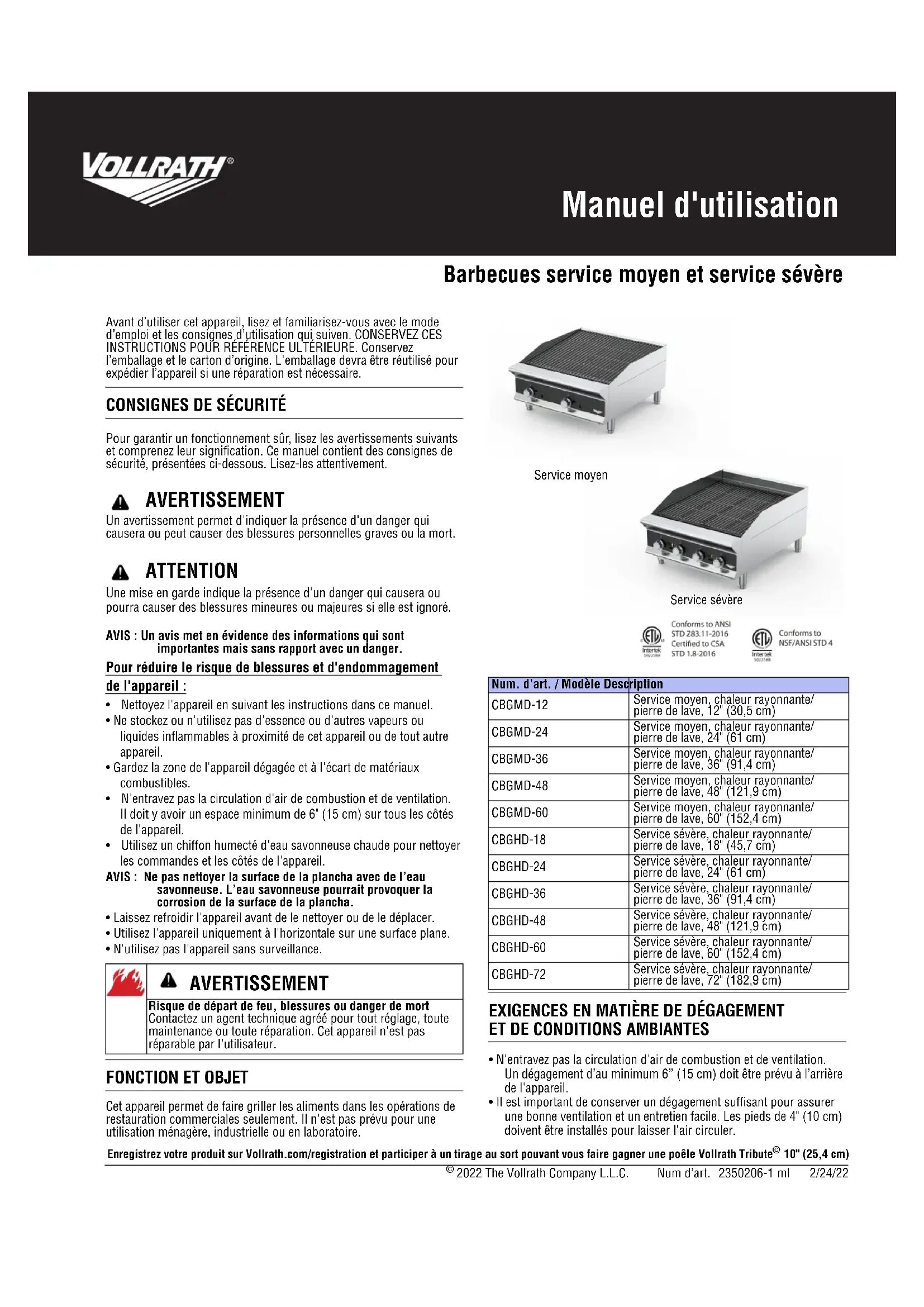 - N'entravez pas la circulation d'air de combustion et de ventilation.Un dégagement d’au minimum 6” (15 cm) doit être prévu à l’arrièrede l'appareil.• Il est important de conserver un dégagement suffisant pour assurerune bonne ventilation et un entretien facile. Les pieds de 4" (10 cm)doivent être installés pour laisser l'air circuler. AVERTISSEMENT ATTENTION AVERTISSEMENT Risque de départ de feu, blessures ou danger de mortContactez un agent technique agréé pour tout réglage, toute maintenance ou toute réparation. Cet appareil n'est pas réparable par l'utilisateur.Num. d’art. / Modèle DescriptionCBGMD-12Service moyen, chaleur rayonnante/pierre de lave, 12" (30,5 cm)CBGMD-24Service moyen, chaleur rayonnante/pierre de lave, 24" (61 cm)CBGMD-36Service moyen, chaleur rayonnante/pierre de lave, 36" (91,4 cm)CBGMD-48Service moyen, chaleur rayonnante/pierre de lave, 48" (121,9 cm)CBGMD-60Service moyen, chaleur rayonnante/pierre de lave, 60" (152,4 cm)CBGHD-18Service sévère, chaleur rayonnante/pierre de lave, 18" (45,7 cm) CBGHD-24Service sévère, chaleur rayonnante/pierre de lave, 24" (61 cm)CBGHD-36Service sévère, chaleur rayonnante/pierre de lave, 36" (91,4 cm)CBGHD-48Service sévère, chaleur rayonnante/pierre de lave, 48" (121,9 cm)CBGHD-60Service sévère, chaleur rayonnante/pierre de lave, 60" (152,4 cm)CBGHD-72Service sévère, chaleur rayonnante/pierre de lave, 72" (182,9 cm) Service moyenService sévère2 Barbecues service moyen et service sévère Manuel d'utilisation INSTALLATION Codes et normes applicables États-Unis Vollrath recommande que tous les équipements de cuisine commerciale soient fournis avec un système de ventilation conformément à NFPA96.