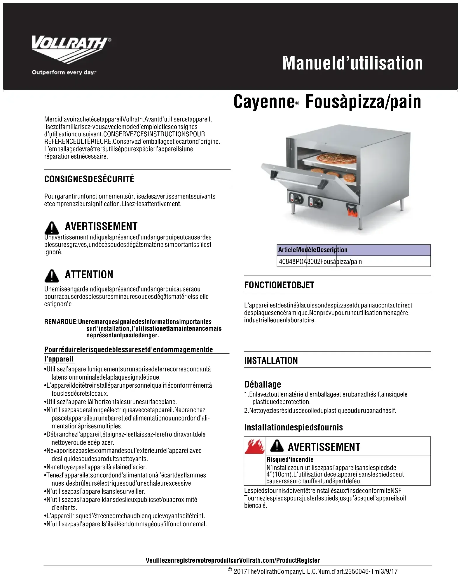 Installation des pieds fournis Les pieds fournis doivent être installés aux fins de conformité NSF. Tournez les pieds pour ajuster les pieds jusqu'à ce que l'appareil soit bien calé. AVERTISSEMENT ATTENTION Article Modèle Description 40848 POA8002 Fous à pizza/pain AVERTISSEMENT Risque d'incendie N'installez ou n'utilisez pas l'appareil sans les pieds de 4” (10 cm). L'utilisation de cet appareil sans les pieds peut causer sa surchauffe et un départ de feu.2 Cayenne