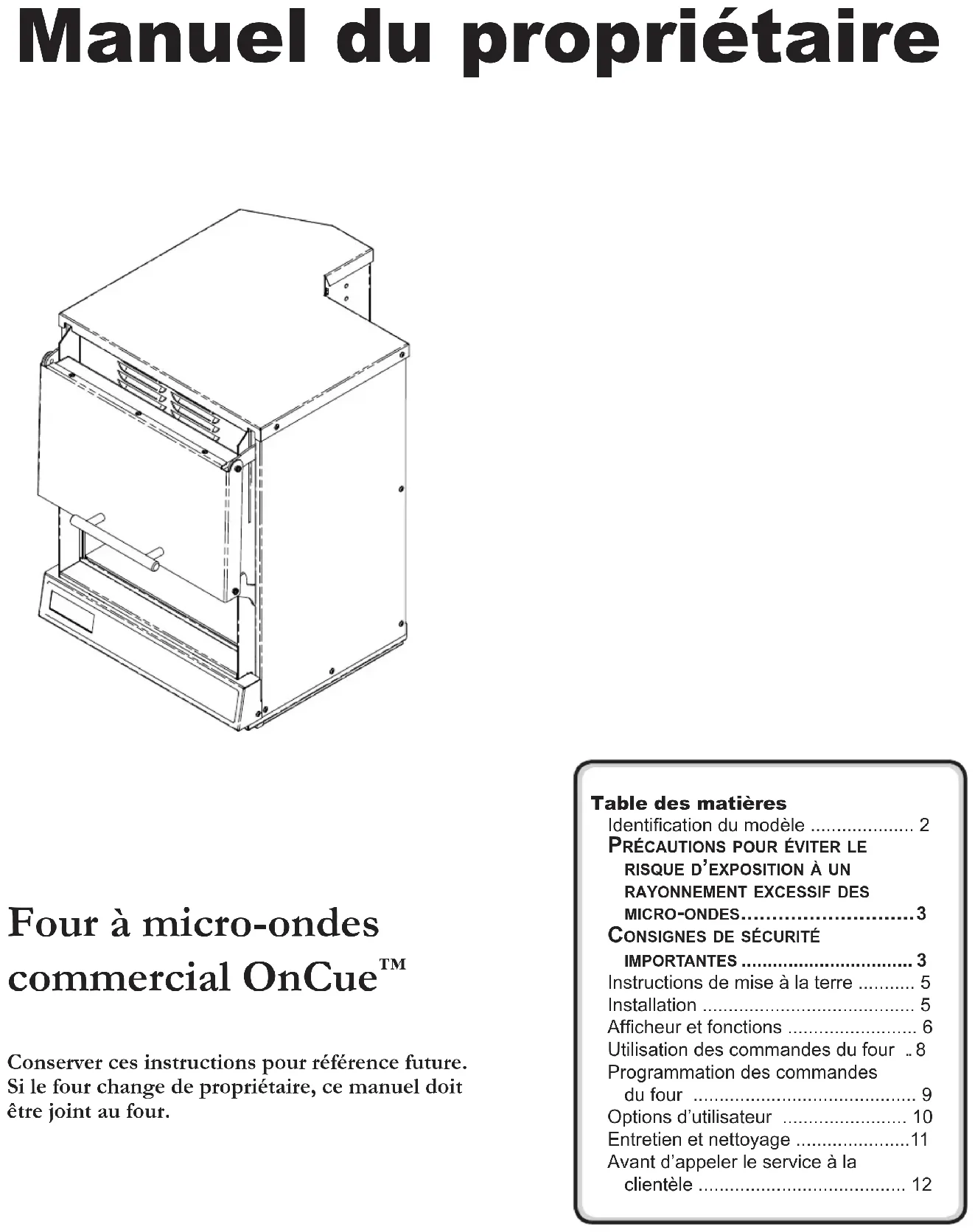 1. LIRE toutes les instructions avant d’utiliser l’appareil.2. Dans la présente section, LIRE ET APPLIQUER spéciquement les « PRÉCAUTIONS POUR ÉVITER LE RISQUE D’EXPOSITION À UN RAYONNEMENT EXCESSIF DES MICRO-ONDES ».3. Cet appareil DOIT ÊTRE MIS À LA TERRE. Brancher l’appareil uniquement dans une prise MISE À LA TERRE adéquatement. Voir « INSTRUCTIONS DE MISE À LA TERRE » à la page 5.4. Installer ou placer cet appareil en respectant STRICTEMENT les instructions d’installation contenues dans ce manuel.5. Certains aliments, notamment les œufs entiers, ainsi que les contenants hermétiquement fermés — par exemple, des pots de verre fermés — peuvent éclater et NE DOIVENT PAS être RÉCHAUFFÉS dans ce four.6. Utiliser cet appareil UNIQUEMENT selon l’usage prévu décrit dans ce manuel. Ne pas utiliser de produits chimiques dans l’appareil car ils peuvent produire des vapeurs corrosives. Ce type de four a été conçu spéciquement pour réchauffer, cuire ou sécher des aliments. Il n’a pas été conçu pour un usage industriel ou un usage en laboratoire.7. Comme pour tout appareil, une SURVEILLANCE ATTENTIVE est requise lorsque des ENFANTS se servent du four à micro-ondes.8. Voir les instructions sur le nettoyage de la porte à la page 11 de ce manuel de sécurité sur le produit.9. NE PAS chauffer de biberons dans le four.10. Les pots d’aliments pour bébés doivent être ouverts lorsqu’ils sont réchauffés, et leur contenu mélangé ou agité avant d’être consommé an d’éviter les brûlures.11. NE PAS utiliser cet appareil si la prise ou le cordon sont endommagés, s’il ne fonctionne pas adéquatement, s’il a été endommagé ou si on l’a laissé tombé.12. Cet appareil, y compris le cordon d’alimentation, doit être réparé UNIQUEMENT par un technicien agréé. Des outils spéciaux sont nécessaires pour réparer cet appareil. Contacter le centre de réparation agréé le plus proche s’il est nécessaire d’inspecter l’appareil, de le réparer ou de le régler.13. NE PAS couvrir ni obstruer les grilles ou les ouvertures de l’appareil.14. NE PAS entreposer cet appareil à l’extérieur. NE PAS utiliser cet appareil à proximité d’un point d’eau – notamment près d’un évier de cuisine, dans un sous-sol humide, près d’une piscine ou dans un emplacement similaire.15. NE PAS immerger le cordon ou la prise dans l’eau.16. ÉLOIGNER le cordon des surfaces CHAUFFÉES.17. NE PAS laisser le cordon pendre sur le rebord d’une table ou d’un comptoir.18. Pour un usage commercial uniquement. Lors de l’utilisation d’un appareil électrique, il incombe d’appliquer des précautions de base sur la sécurité an de réduire les risques de brûlures, de choc électrique, d’incendie ou de blessures, ainsi que de suivre les directives suivantes.