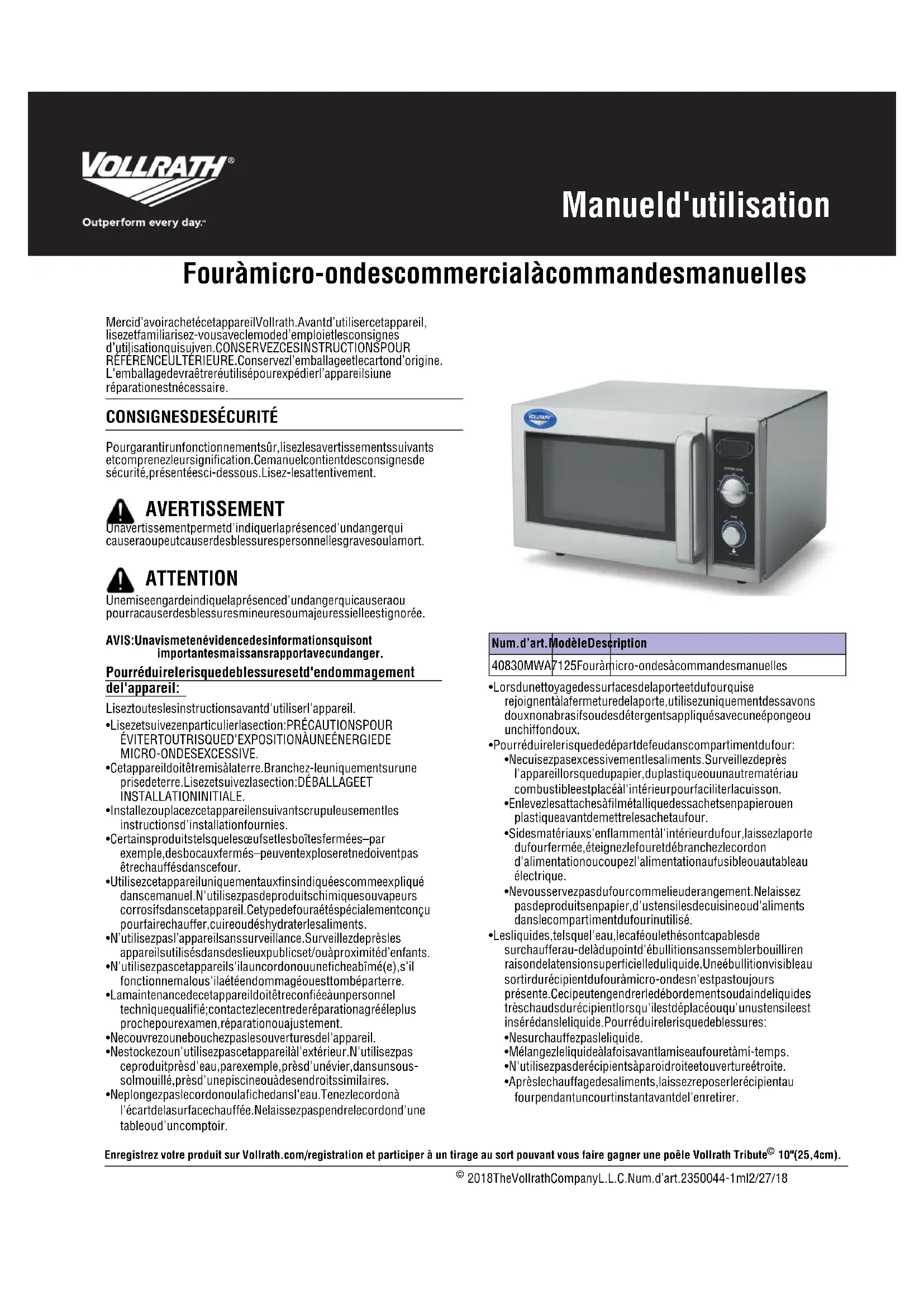 40830 - Four à micro-ondes Vollrath - Notice d'utilisation et mode d'emploi gratuit