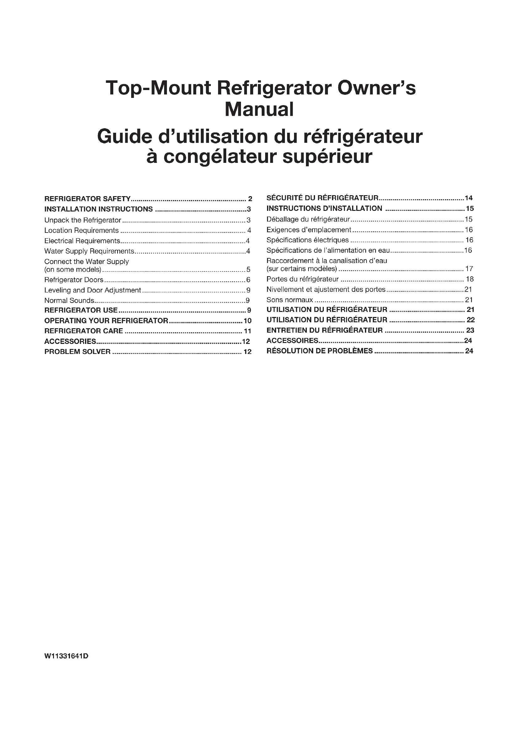 Commander le numéro de pièceW10355010 ACCESSOIRES AVERTISSEMENT Risque de choc électrique Brancher sur une prise à 3 alvéoles reliée à la terre. Ne pas enlever la broche de liaison à la terre. Ne pas utiliser un adaptateur. Ne pas utiliser un câble de rallonge. Le non-respect de ces instructions peut causer un décès, un incendie ou un choc électrique. AVERTISSEMENT Risque d’explosion Utiliser un produit nettoyant ininammable. Le non-respect de cette instruction peut entraîner la mort, une explosion ou un incendie.25 Si les problèmes suivants surviennent Causes possibles et solutions recommandées Le réfrigérateur ne fonctionne pas ■ Non raccordé à l’alimentation électrique – Brancher le cordon d’alimentation dans une prise à 3alvéoles reliée à la terre. Ne pas utiliser de rallonge. ■ Pas d’alimentation au niveau de la prise – Brancher une lampe pour voir si la prise électrique fonctionne. ■ Un fusible du domicile est grillé ou le disjoncteur s’est ouvert – Remplacer le fusible ou réenclencher le disjoncteur. Si le problème persiste, appeler un électricien. ■ La commande n’est pas allumée – Mettre en marche la commande du réfrigérateur. Voir la section « Utilisation des commandes ». ■ Nouvelle installation – Attendre 24 heures après l’installation pour permettre au réfrigérateur de refroidir complètement. REMARQUE: Le fait de régler les commandes de température sur le réglage le plus froid ne refroidira pas le compartiment plus rapidement. Le moteur semble fonctionner excessivement. Votre nouveau réfrigérateur fonctionnera peut-être plus longtemps que votre appareil précédent. Lesréfrigérateurs éconergiques fonctionnent plus longtemps à des vitesses inférieures, plus éconergiques. Le réfrigérateur peut fonctionner encore plus longtemps si la température de la pièce est élevée, si une grande quantité de nourriture aété ajoutée, si la porte est fréquemment ouverte ou si elle est laissée ouverte. Le réfrigérateur est bruyant Le bruit émis par les réfrigérateurs a été réduit au cours des années. Les bruits de fonctionnement étant moins importants, il sera possible de remarquer des bruits inconnus qui sont en réalité normaux. Voici quelques sons normaux accompagnés d’une explication: ■ Bourdonnement – Se fait entendre lorsque le robinet d’eau s’ouvre pour remplir la machine à glaçons ■ Cliquètement/crépitement – Ouverture ou fermeture des robinets ■ Pulsation – Les ventilateurs/le compresseur se règlent afin d’optimiser la performance ■ Cliquetis – écoulement de liquide réfrigérant, mouvement des conduites d’eau ou d’objets posés sur le dessus du réfrigérateur ■ Grésillement/gargouillement – de l’eau tombe sur l’élément de chauffage durant le programme de dégivrage ■ Bruit d’éclatement – Contraction/expansion des parois internes, particulièrement lors du refroidissement initial ■ Bruit d’écoulement d’eau – Peut être entendu lorsque la glace fond lors du programme de dégivrage et que l’eau s’écoule dans le plateau de dégivrage ■ Grincement/craquement – Se produit lorsque la glace est éjectée du moule à glaçons. La porte ne ferme pas complètement ■ La porte est bloquée en position ouverte – Déplacer les aliments sous emballage pour dégager la porte. Replacer le compartiment ou la tablette en position correcte Vérifier que le couvercle du bac à légumes est enfoncé complètement de sorte que l’arrière repose sur les supports. La porte est difficile à ouvrir ■ Les joints sont sales ou collants – Nettoyer les joints et les surfaces au savon doux et à l’eau tiède. Rincer et sécher avec un linge doux. La température est trop élevée ■ Nouvelle installation – Attendre 24 heures après l’installation pour permettre au réfrigérateur de refroidir complètement. ■ La/les porte(s) sont fréquemment ouvertes ou ne sont pas complètement fermées – Cela permet à l’air chaud de pénétrer dans le réfrigérateur. Réduire les ouvertures de porte et garder la porte complètement fermée. ■ Une grande quantité d’aliments chauds a été récemment ajoutée – Attendre quelques heures pour permettre au réfrigérateur de revenir à une température normale. ■ Vérifier que le réglage des/de la commande(s) de température est adapté à l’environnement de l’appareil – Régler les commandes à un réglage plus froid. Vérifier la température au bout de 24 heures. Voir la section « Utilisation des commandes ». Il y a accumulation d’humidité à l’intérieur REMARQUE: Une certaine accumulation d’humidité est normale. ■ Pièce humide – Ceci contribue à l’accumulation de l’humidité dans le réfrigérateur. ■ La/les porte(s) sont fréquemment ouvertes ou ne sont pas complètement fermées – Cela permet à l’air humide de pénétrer dans le réfrigérateur. Réduire les ouvertures de porte et garder la porte complètement fermée. La machine à glaçons ne produit pas ou pas suffisamment de glaçons ■ La machine à glaçons n’est pas raccordée à l’alimentation en eau – Raccorder le réfrigérateur à l’alimentation en eau et ouvrir complètement le robinet d’arrêt d’eau. ■ Une déformation de la canalisation peut réduire le débit d’eau – Redresser la canalisation d’eau. ■ La machine à glaçons est éteinte – S’assurer que le bras de commande de la machine à glaçons ou l’interrupteur (selon les modèles) sont bien à la position ON (marche). ■ Nouvelle installation – Attendre 24 heures après l’installation de la machine à glaçons pour que la production de glaçons commence. Attendre 3 jours pour que la production de glaçons soit complète. ■ Une grande quantité de glaçons a été récemment prélevée – Accorder suffisamment de temps à la machine à glaçons pour produire plus de glaçons. ■ Gla