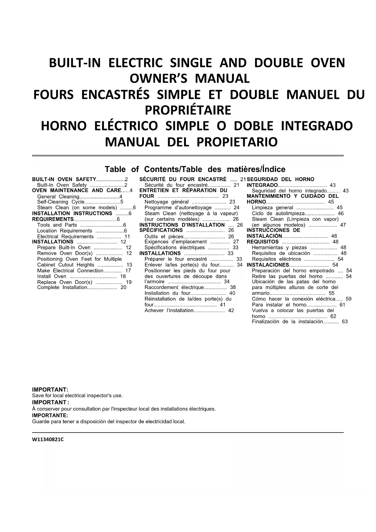 un chiffon humide. Pour arrêter le programme d’autonettoyage à tout moment : Appuyer sur la touche Cancel (annuler) du clavier du four pour les modèles à four simple ou des claviers pour les modèles de four double. Si la température du four est trop élevée, la porte reste verrouillée. Elle ne se déverrouille pas tant que le four n’a pas refroidi.26 Steam Clean (nettoyage à la vapeur) (sur certains modèles) La fonction de nettoyage à la vapeur est conçue pour un nettoyage léger de la cavité inférieure sur les modèles équipés d’un élément de cuisson dissimulé dans les deux fours. Laisser le four refroidir et atteindre la température ambiante avant d’utiliser le programme de nettoyage à la vapeur. Si la température de la cavité du four est supérieure à 200 °F (93 °C), la fonction de nettoyage à la vapeur ne s’active pas. Elle attendra que la température soit moins élevée. Retirer les grilles et accessoires de la cavité du four. Pour de meilleurs résultats, utiliser 10 oz (295,7 mL) d’eau distillée ou filtrée. Ne pas utiliser de nettoyants à four. La fonction de nettoyage à la vapeur fonctionne pendant environ 1 heure. Un signal sonore sera émis à la fin du programme. IMPORTANT: Puisque l’eau dans le fond du four est chaude, ne pas ouvrir la porte du four pendant le cycle de nettoyage à la vapeur. Toucher Oven Cancel (annulation de la fonction d’alimentation du four) ou Upper/Lower (supérieur/inférieur) sur les modèles à four double pour mettre fin au cycle en tout temps. L’affichage de l’heure est rétabli. Conseils utiles Une fois le programme de nettoyage à la vapeur terminé et le four complètement refroidi, essuyer l’eau restante dans le fond du four à l’aide d’une éponge ou d’un linge. Essuyer toute humidité présente dans l’intérieur du four, les parois latérales internes de la cavité du four et la table de cuisson. Utiliser une brosse à poils doux ou un ustensile de récurage en nylon pour essuyer l’intérieur du four. Ceci pourra être utile pour les taches les plus tenaces. II est recommandé d’utiliser une eau distillée ou filtrée, car l’eau du robinet peut laisser des dépôts minéraux sur le fond du four. Utiliser un linge imbibé de vinaigre ou de jus de citron pour retirer tout dépôt de minéraux qui peut être présent après le programme de nettoyage à la vapeur. Si le four est très sale, utiliser le programme d’autonettoyage. Le programme de nettoyage à la vapeur peut être utilisé pour éliminer la majorité des débris, ce qui rendra le programme d’autonettoyage plus efficace. Nettoyage à la vapeur :