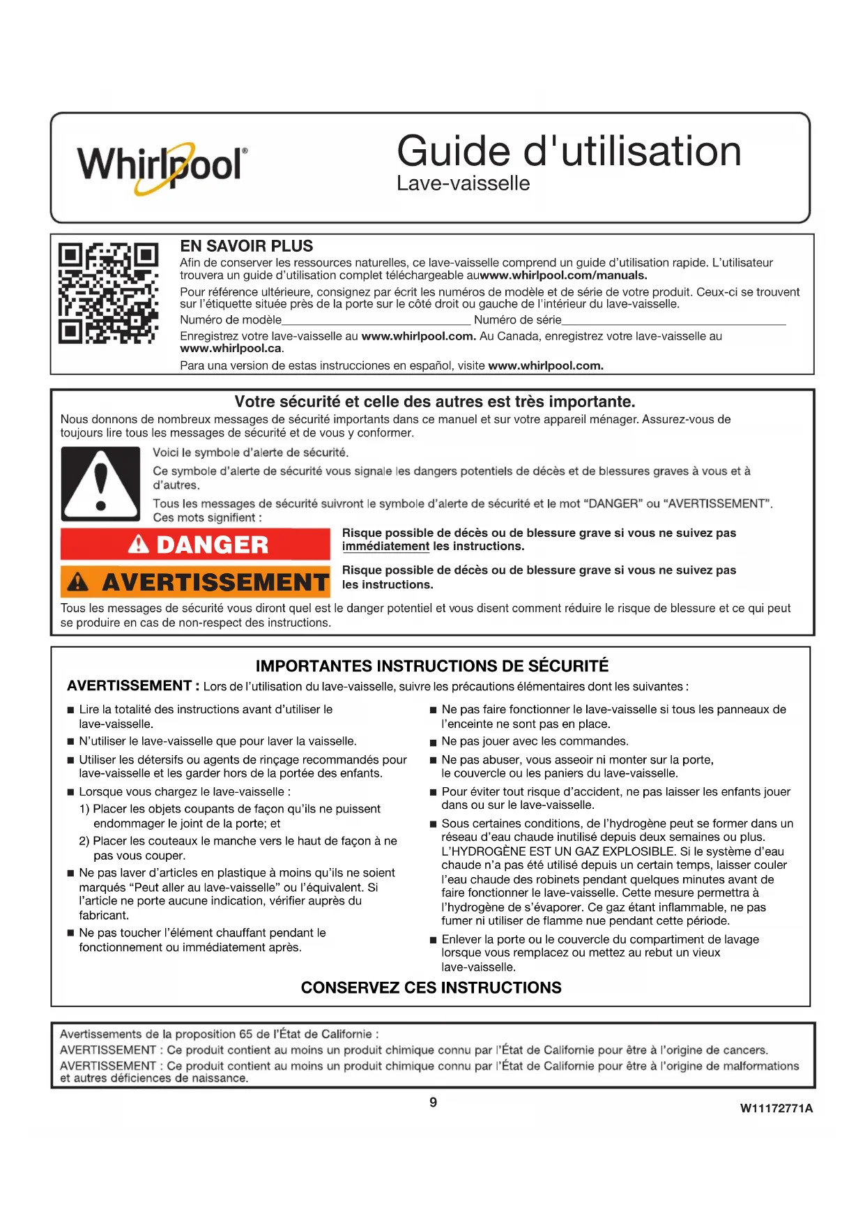 An de conserver les ressources naturelles, ce lave-vaisselle comprend un guide d’utilisation rapide. L’utilisateur trouvera un guide d’utilisation complet téléchargeable auwww.whirlpool.com/manuals.Pour référence ultérieure, consignez par écrit les numéros de modèle et de série de votre produit. Ceux-ci se trouvent sur l’étiquette située près de la porte sur le côté droit ou gauche de l'intérieur du lave-vaisselle. Numéro de modèle________________________________ Numéro de série______________________________________ Enregistrez votre lave-vaisselle au www.whirlpool.com. Au Canada, enregistrez votre lave-vaisselle au www.whirlpool.ca.Para una version de estas instrucciones en español, visite www.whirlpool.com.Risque possible de décès ou de blessure grave si vous ne suivez pas immédiatement les instructions.Risque possible de décès ou de blessure grave si vous ne suivez pas les instructions. Tous les messages de sécurité vous diront quel est le danger potentiel et vous disent comment réduire le risque de blessure et ce qui peut se produire en cas de non-respect des instructions. Votre sécurité et celle des autres est très importante. Nous donnons de nombreux messages de sécurité importants dans ce manuel et sur votre appareil ménager. Assurez-vous de toujours lire tous les messages de sécurité et de vous y conformer. AVERTISSEMENT DANGER