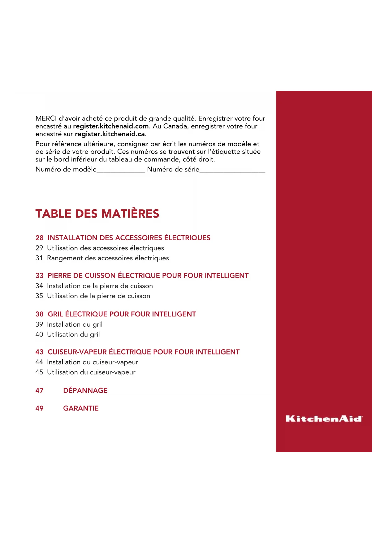 In the United States and Puerto Rico: For service information, or to order accessories or replacement parts, call toll-free at 1-800-541-6390 or write to: Customer eXperience Center, KitchenAid Small Appliances, P.O. Box 218, St. Joseph, MI 49085-0218 Outside the United States and Puerto Rico: Consult your local KitchenAid dealer or the store where you purchased the +Powered Attachments for information on how to obtain service. For service information in Canada: Call toll-free 1-800-807-6777. 26 | WARRANTYMERCI d’avoir acheté ce produit de grande qualité. Enregistrer votre four encastré au register.kitchenaid.com. Au Canada, enregistrer votre four encastré sur register.kitchenaid.ca. Pour référence ultérieure, consignez par écrit les numéros de modèle et de série de votre produit. Ces numéros se trouvent sur l’étiquette située sur le bord inférieur du tableau de commande, côté droit. Numéro de modèle______________ Numéro de série___________________