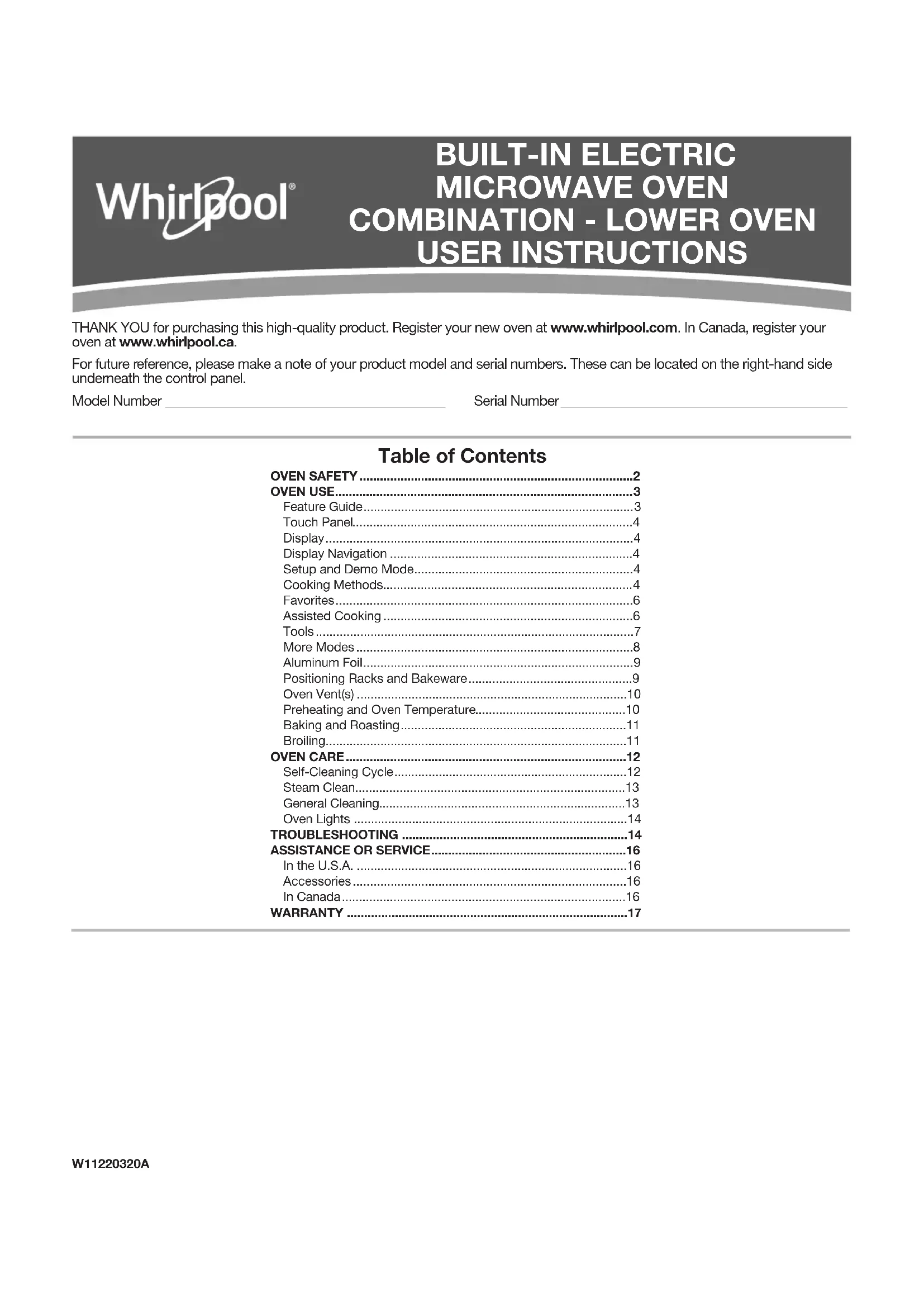 enlevés, modifiés ou ne peuvent pas être facilement identifiés.Le coût d’une réparation ou d’un remplacement dans le cadre de ces circonstances exclues est à la charge du client. 11/14CLAUSE D’EXONÉRATION DE RESPONSABILITÉ AU TITRE DES GARANTIES IMPLICITESLES GARANTIES IMPLICITES, Y COMPRIS LES GARANTIES APPLICABLES DE QUALITÉ MARCHANDE OU D’APTITUDE À UN USAGE PARTICULIER, SONT LIMITÉES À UN AN OU À LA PLUS COURTE PÉRIODE AUTORISÉE PAR LA LOI. Certains États et provinces ne permettent pas de limitation sur la durée des garanties implicites de qualité marchande ou d’aptitude à un usage particulier, de sorte que la limitation ci-dessus peut ne pas être applicable dans votre cas. Cette garantie vous confère des droits juridiques spécifiques et vous pouvez également jouir d’autres droits qui peuvent varier d’une juridiction à l’autre.EXONÉRATION DE RESPONSABILITÉ DANS LES DOMAINES NON COUVERTS PAR LA GARANTIE Whirlpool décline toute responsabilité au titre de la qualité, de la durabilité ou en cas de dépannage ou de réparation nécessaire sur ce gros appareil ménager autre que les responsabilités énoncées dans la présente garantie. Si vous souhaitez une garantie plus étendue ou plus complète que la garantie limitée fournie avec ce gros appareil ménager, adressez-vous à Whirlpool ou à votre détaillant pour obtenir les modalités d’achat d’une garantie étendue.LIMITATION DES RECOURS; EXCLUSION DES DOMMAGES FORTUITS OU INDIRECTSLE SEUL ET EXCLUSIF RECOURS DU CLIENT DANS LE CADRE DE LA PRÉSENTE GARANTIE LIMITÉE CONSISTE EN LA RÉPARATION PRÉVUE PAR LA PRÉSENTE. WHIRLPOOL N’ASSUME AUCUNE RESPONSABILITÉ POUR LES DOMMAGES FORTUITS OU INDIRECTS. Certains États et certaines provinces ne permettent pas l’exclusion ou la limitation des dommages fortuits ou indirects de sorte que ces limitations et exclusions peuvent ne pas être applicables dans votre cas. Cette garantie vous confère des droits juridiques spécifiques et vous pouvez également jouir d’autres droits qui peuvent varier d’une juridiction à l’autre.35 LE AGRADECEMOS la compra de este producto de alta calidad. Registre su nuevo horno en www.whirlpool.com. En Canadá, registre su horno en www.whirlpool.ca. Para referencia futura, tome nota de los números de modelo y de serie de su producto; Pueden encontrarse del lado derecho debajo del panel de control. Número de modelo ______________________________________ Número de serie _________________________________________ Índice