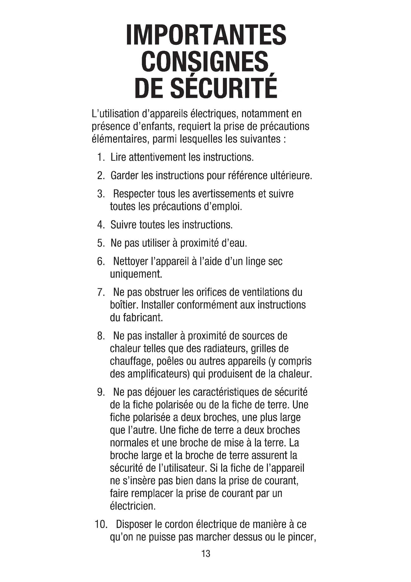 . Veuillez lire attentivement le mode d’emploi pour assurer une installation et une utilisation adéquates. Les informations contenues dans ce document sont sujettes à changement et ne représentent pas un engagement de la part de Conair Corporation. Aucune partie de ce document ne peut être reproduite, transmise sous quelque forme ou par quelque moyen que ce soit, électronique ou mécanique, y compris photocopie, enregistrement ou stockage d’information, ou traduite dans une autre langue à d’autres fins que l’usage personnel de l’acheteur, sans la permission écrite de Conair. Caractéristiques