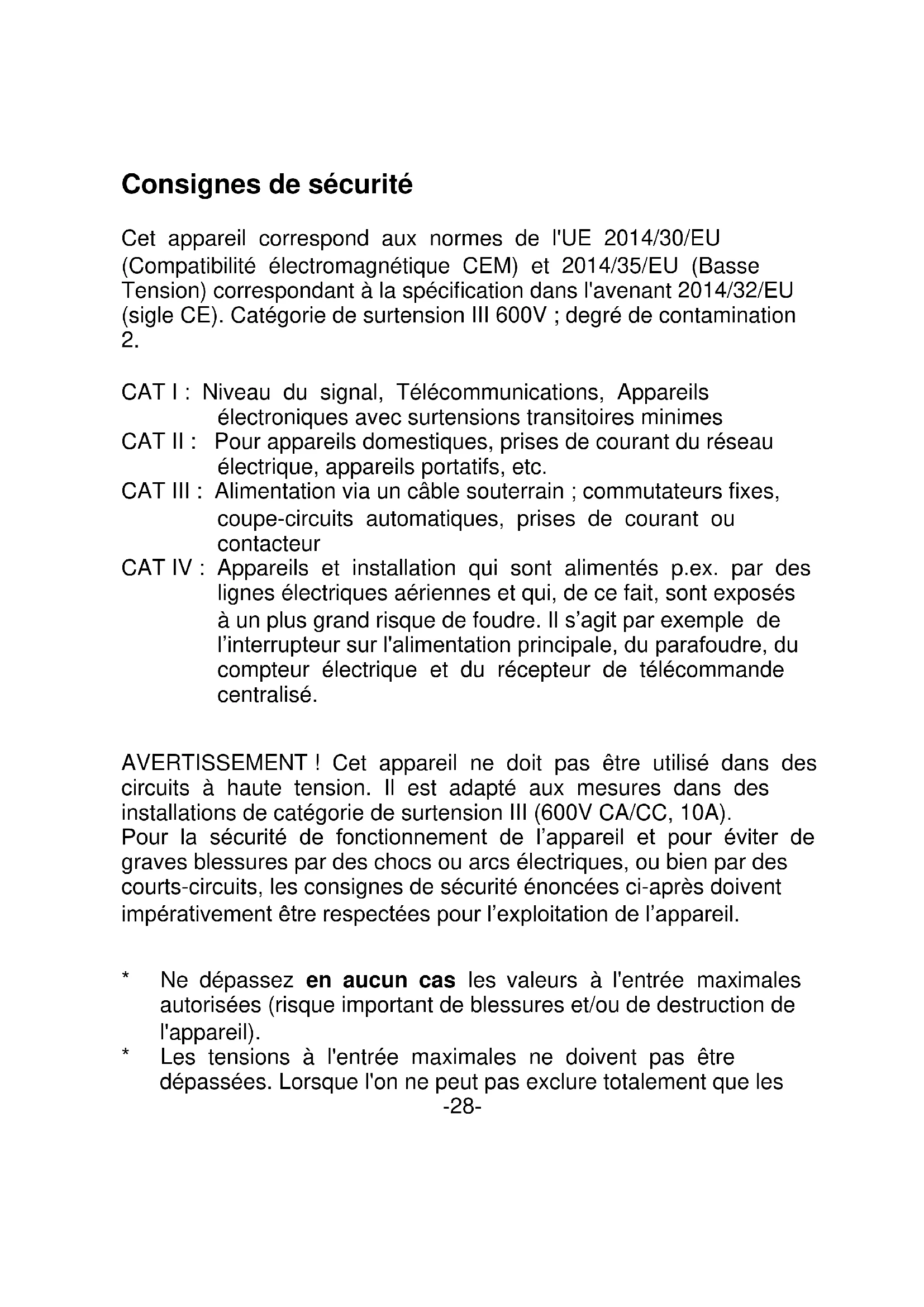 CAT I : Niveau du signal, Télécommunications, Appareils électroniques avec surtensions transitoires minimes CAT II : Pour appareils domestiques, prises de courant du réseau électrique, appareils portatifs, etc. CAT III : Alimentation via un câble souterrain ; commutateurs fixes, coupe-circuits automatiques, prises de courant ou contacteur CAT IV : Appareils et installation qui sont alimentés p.ex. par des lignes électriques aériennes et qui, de ce fait, sont exposés à un plus grand risque de foudre. Il s’agit par exemple de l’interrupteur sur l'alimentation principale, du parafoudre, du compteur électrique et du récepteur de télécommande centralisé. AVERTISSEMENT ! Cet appareil ne doit pas être utilisé dans des circuits à haute tension. Il est adapté aux mesures dans des installations de catégorie de surtension III (600V CA/CC, 10A). Pour la sécurité de fonctionnement de l’appareil et pour éviter de graves blessures par des chocs ou arcs électriques, ou bien par des courts-circuits, les consignes de sécurité énoncées ci-après doivent impérativement être respectées pour l’exploitation de l’appareil.