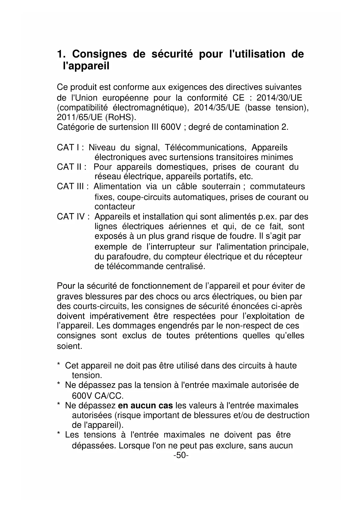 -49-1. Consignes de sécurité pour l'utilisation de l'appareil Ce produit est conforme aux exigences des directives suivantes de l'Union européenne pour la conformité CE : 2014/30/UE (compatibilité électromagnétique), 2014/35/UE (basse tension), 2011/65/UE (RoHS). Catégorie de surtension III 600V ; degré de contamination 2. CAT I : Niveau du signal, Télécommunications, Appareils électroniques avec surtensions transitoires minimes CAT II : Pour appareils domestiques, prises de courant du réseau électrique, appareils portatifs, etc. CAT III : Alimentation via un câble souterrain ; commutateurs fixes, coupe-circuits automatiques, prises de courant ou contacteur CAT IV : Appareils et installation qui sont alimentés p.ex. par des lignes électriques aériennes et qui, de ce fait, sont exposés à un plus grand risque de foudre. Il s’agit par exemple de l’interrupteur sur l'alimentation principale, du parafoudre, du compteur électrique et du récepteur de télécommande centralisé. Pour la sécurité de fonctionnement de l’appareil et pour éviter de graves blessures par des chocs ou arcs électriques, ou bien par des courts-circuits, les consignes de sécurité énoncées ci-après doivent impérativement être respectées pour l’exploitation de l’appareil. Les dommages engendrés par le non-respect de ces consignes sont exclus de toutes prétentions quelles qu’elles soient.