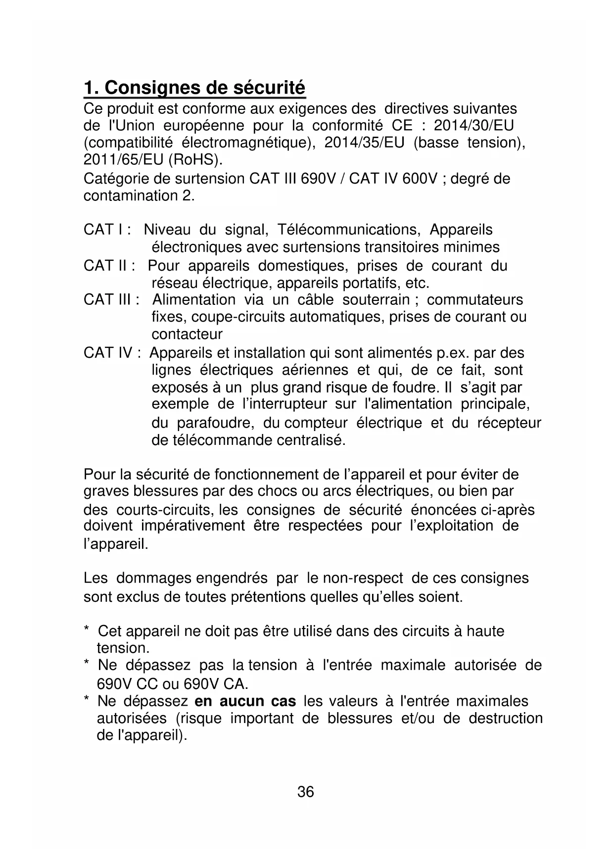 Ce produit est conforme aux exigences des directives suivantes de l'Union européenne pour la conformité CE : 2014/30/EU (compatibilité électromagnétique), 2014/35/EU (basse tension), 2011/65/EU (RoHS). Catégorie de surtension CAT III 690V / CAT IV 600V ; degré de contamination 2. CAT I : Niveau du signal, Télécommunications, Appareils électroniques avec surtensions transitoires minimes CAT II : Pour appareils domestiques, prises de courant du réseau électrique, appareils portatifs, etc. CAT III : Alimentation via un câble souterrain ; commutateurs fixes, coupe-circuits automatiques, prises de courant ou contacteur CAT IV : Appareils et installation qui sont alimentés p.ex. par des lignes électriques aériennes et qui, de ce fait, sont exposés à un plus grand risque de foudre. Il s’agit par exemple de l’interrupteur sur l'alimentation principale, du parafoudre, du compteur électrique et du récepteur de télécommande centralisé. Pour la sécurité de fonctionnement de l’appareil et pour éviter de graves blessures par des chocs ou arcs électriques, ou bien par des courts-circuits, les consignes de sécurité énoncées ci-après doivent impérativement être respectées pour l’exploitation de l’appareil. Les dommages engendrés par le non-respect de ces consignes sont exclus de toutes prétentions quelles qu’elles soient.