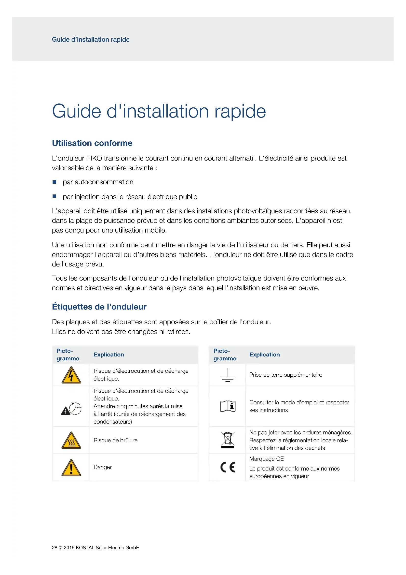 par injection dans le réseau électrique public L'appareil doit être utilisé uniquement dans des installations photovoltaïques raccordées au réseau, dans la plage de puissance prévue et dans les conditions ambiantes autorisées. L'appareil n'est pas conçu pour une utilisation mobile. Une utilisation non conforme peut mettre en danger la vie de l'utilisateur ou de tiers. Elle peut aussi endommager l'appareil ou d'autres biens matériels. L'onduleur ne doit être utilisé que dans le cadre de l'usage prévu. Tous les composants de l'onduleur ou de l'installation photovoltaïque doivent être conformes aux normes et directives en vigueur dans le pays dans lequel l'installation est mise en œuvre. Étiquettes de l'onduleur Des plaques et des étiquettes sont apposées sur le boîtier de l'onduleur. Elles ne doivent pas être changées ni retirées. Picto- gramme Explication Picto- gramme Explication Risque d'électrocution et de décharge électrique. Prise de terre supplémentaire 5 min Risque d'électrocution et de décharge électrique. Attendre cinq minutes après la mise à l'arrêt (durée de déchargement des condensateurs) Consulter le mode d'emploi et respecter ses instructions 5 min Risque de brûlure Ne pas jeter avec les ordures ménagères. Respectez la réglementation locale rela- tive à l'élimination des déchets Danger Marquage CE Le produit est conforme aux normes européennes en vigueur© 2019 KOSTAL Solar Electric GmbH 29