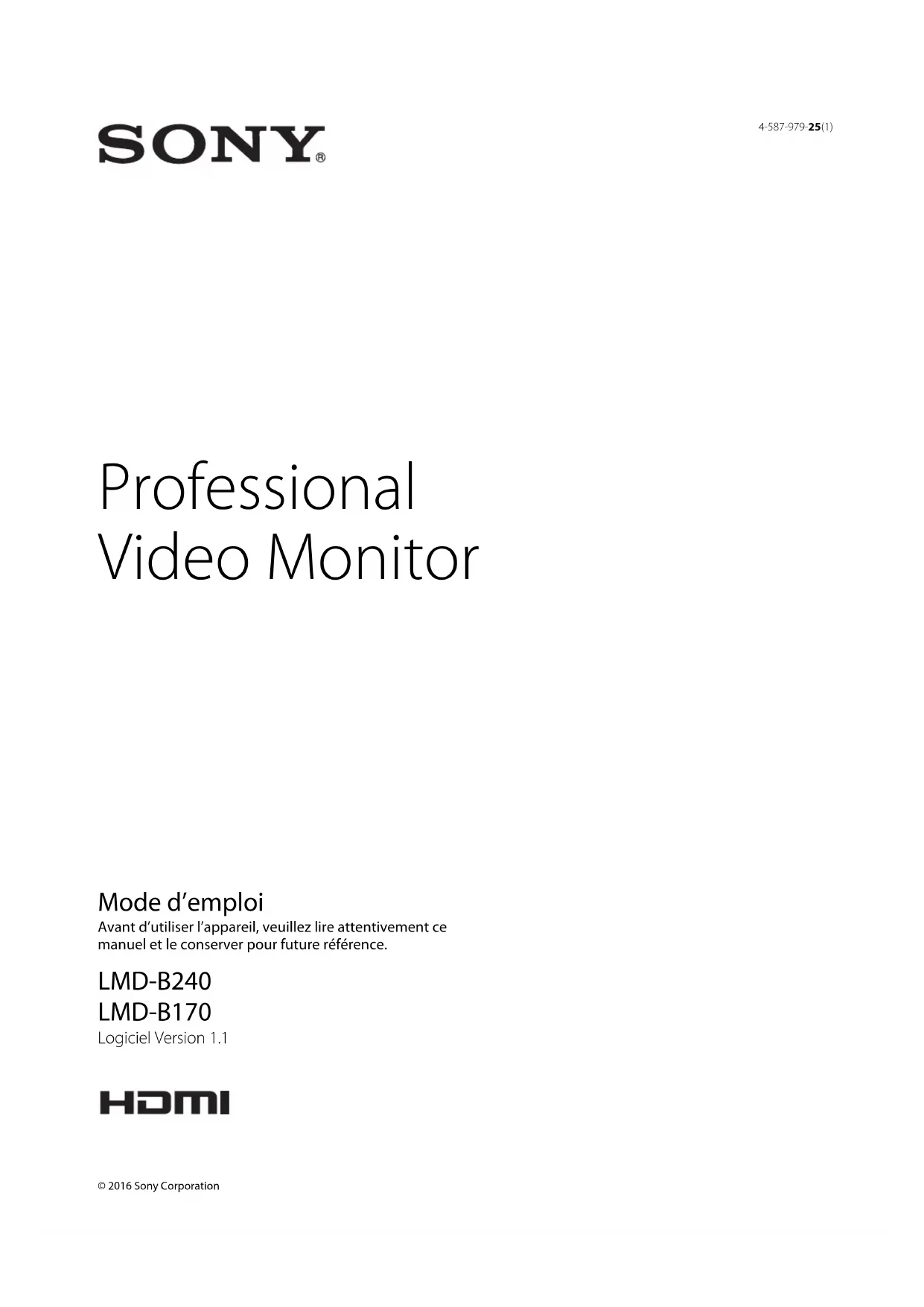 4-587-979-25(1) Professional Video Monitor Mode d’emploi Avant d’utiliser l’appareil, veuillez lire attentivement ce manuel et le conserver pour future référence. LMD-B240 LMD-B170 Logiciel Version 1.1 © 2016 Sony Corporation2 AVERTISSEMENT Afin de réduire les risques d’incendie ou d’électrocution, ne pas exposer cet appareil à la pluie ou à l’humidité. Afin d’écarter tout risque d’électrocution, garder le coffret fermé. Ne confier l’entretien de l’appareil qu’à un personnel qualifié. CET APPAREIL DOIT ÊTRE RELIÉ À LA TERRE. AVERTISSEMENT Lors de l’installation de l’appareil, incorporer un dispositif de coupure dans le câblage fixe ou brancher la fiche d’alimentation dans une prise murale facilement accessible proche de l’appareil. En cas de problème lors du fonctionnement de l’appareil, enclencher le dispositif de coupure d’alimentation ou débrancher la fiche d’alimentation. Pour LMD-B240 La ventilation ne doit pas être entravée en couvrant les fentes d'aération par des objets tels que des journaux, nappes, rideaux ou autre. Aucune source de flamme nue, tel que des bougies, ne doit être placée sur l'appareil. AVERTISSEMENT Eviter d’exposer l’appareil à un égouttement ou à des éclaboussures. Ne placer aucun objet rempli de liquide, comme un vase, sur l’appareil.