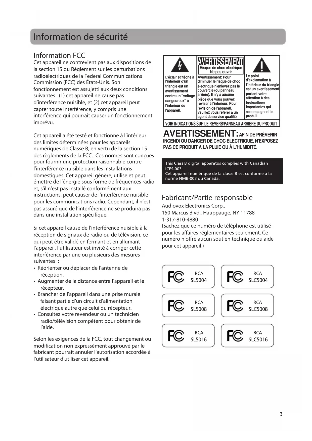 - Consultez votre revendeur ou un technicien radio/télévision compétent pour obtenir de l’aide. Selon les exigences de la FCC, tout changement ou modification non expressément approuvé par le fabricant pourrait annuler l’autorisation accordée à l’utilisateur d'utiliser cet appareil. RCA SL5004 RCA SL5008 RCA SL5016 RCA SLC5004 RCA SLC5008 RCA SLC5016 AVERTISSEMENT Risque de choc électrique Ne pas ouvrirL'éclair et flèche à l'intérieur d'un triangle est un avertissement contre un "voltage dangeureux" à l'intérieur de l'appareil.Avertissement: Pour diminuer le risque de choc électrique n'enlevez pas le couvercle (ou panneau arrière). Il n'y a aucune pièce que vous pouvez réviser à l'intérieur. Pour révision de l'appareil, veuillez vous référer à un agent de service qualifié.Le point d'exclamation à l'intérieur du triangle est un avertissement portant votre attention à des instructions importantes qui accompagnent le produit.