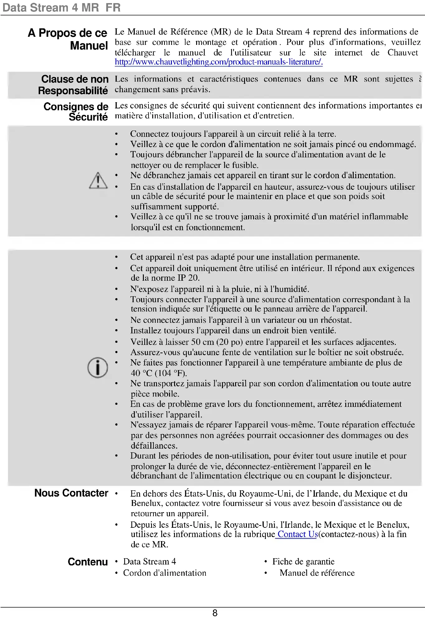 Le Manuel de Référence (MR) de le Data Stream 4 reprend des informations de base sur comme le montage et opération . Pour plus d'informations, veuillez télécharger le manuel de l'utilisateur sur le site internet de Chauvet