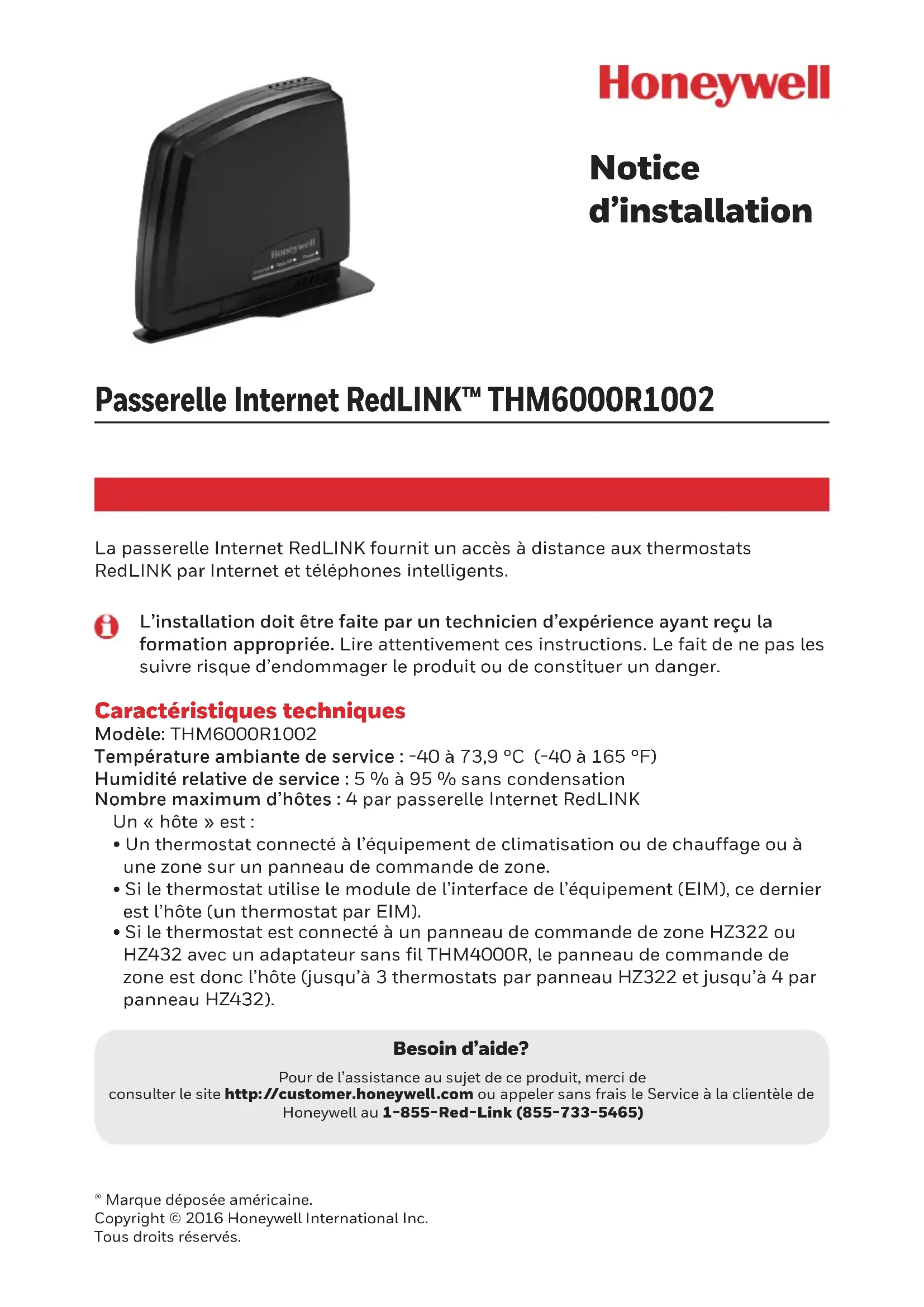 Operation is subject to the following two conditions: 1 this device may not cause interference, and 2 this device must accept any interference, including interference that may cause undesired operation of the device.Passerelle Internet RedLINK™ THM6000R1002 Notice d’installation ® Marque déposée américaine. Copyright © 2016 Honeywell International Inc. Tous droits réservés. La passerelle Internet RedLINK fournit un accès à distance aux thermostats RedLINK par Internet et téléphones intelligents. L’installation doit être faite par un technicien d’expérience ayant reçu la formation appropriée. Lire attentivement ces instructions. Le fait de ne pas les suivre risque d’endommager le produit ou de constituer un danger. Caractéristiques techniques Modèle: THM6000R1002 Température ambiante de service : -40 à 73,9 °C (-40 à 165 °F) Humidité relative de service : 5 % à 95 % sans condensation Nombre maximum d’hôtes : 4 par passerelle Internet RedLINK Un « hôte » est :