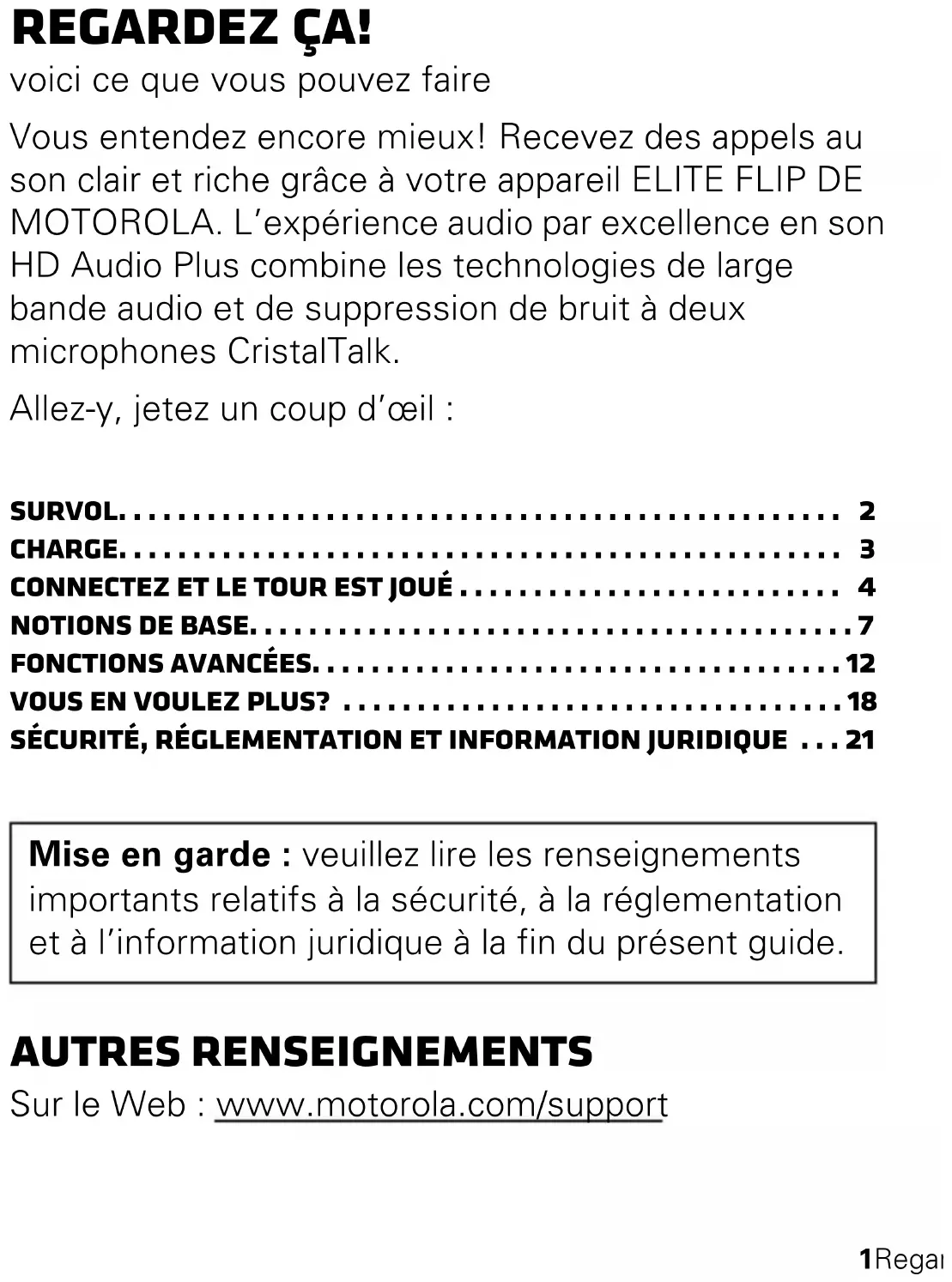 de votre téléphone est activée. Si la fonction Bluetooth était désactivée ou seulement activée de manière temporaire, vous devrez peut-être la réactiver et recommencer la procédure d’appariement du téléphone et de l’écouteur. Consultez la section « deuxième appareil », à la page 12.20 Vous en voulez plus? Connectez-vous avec Motorola Obtenez ce que vous voulez :